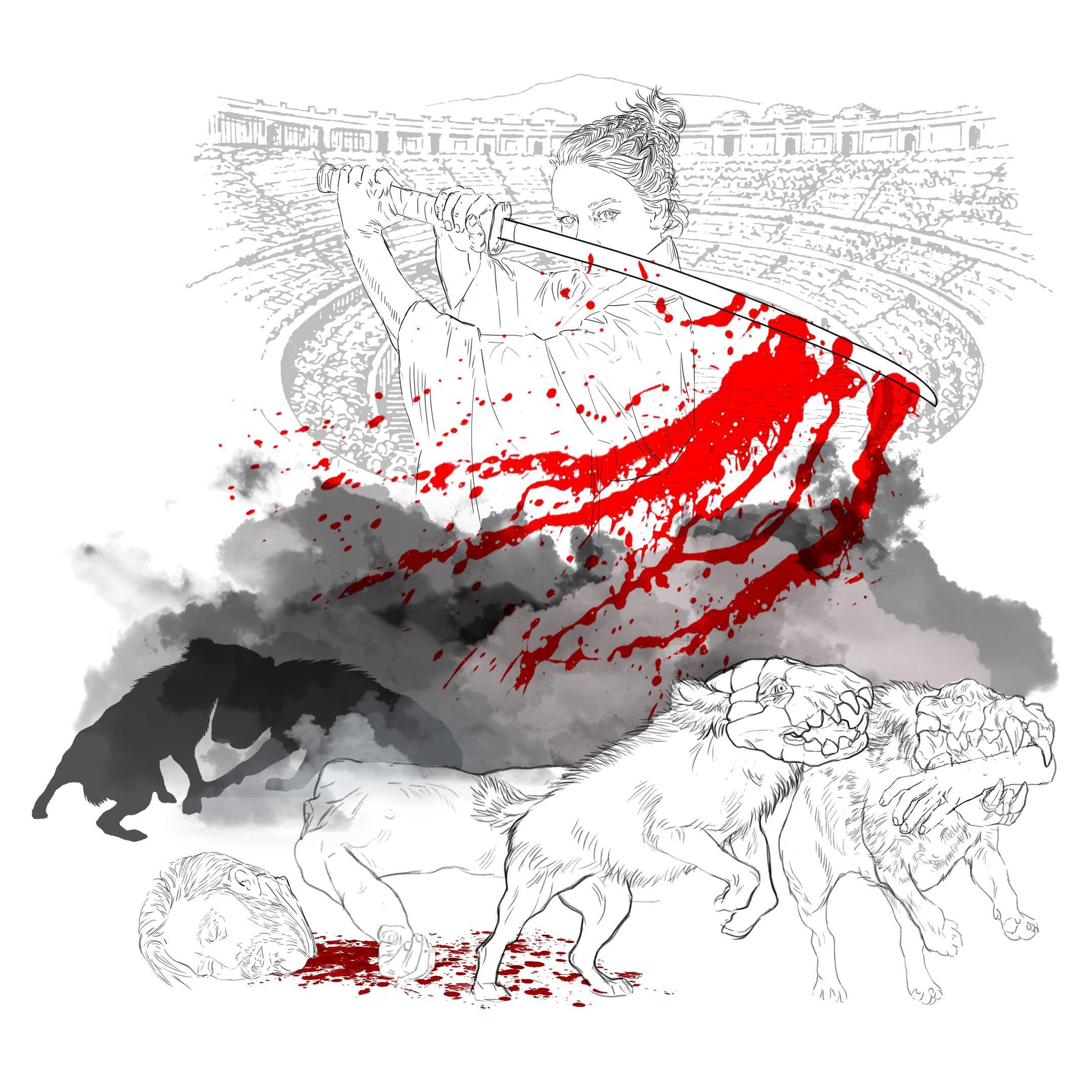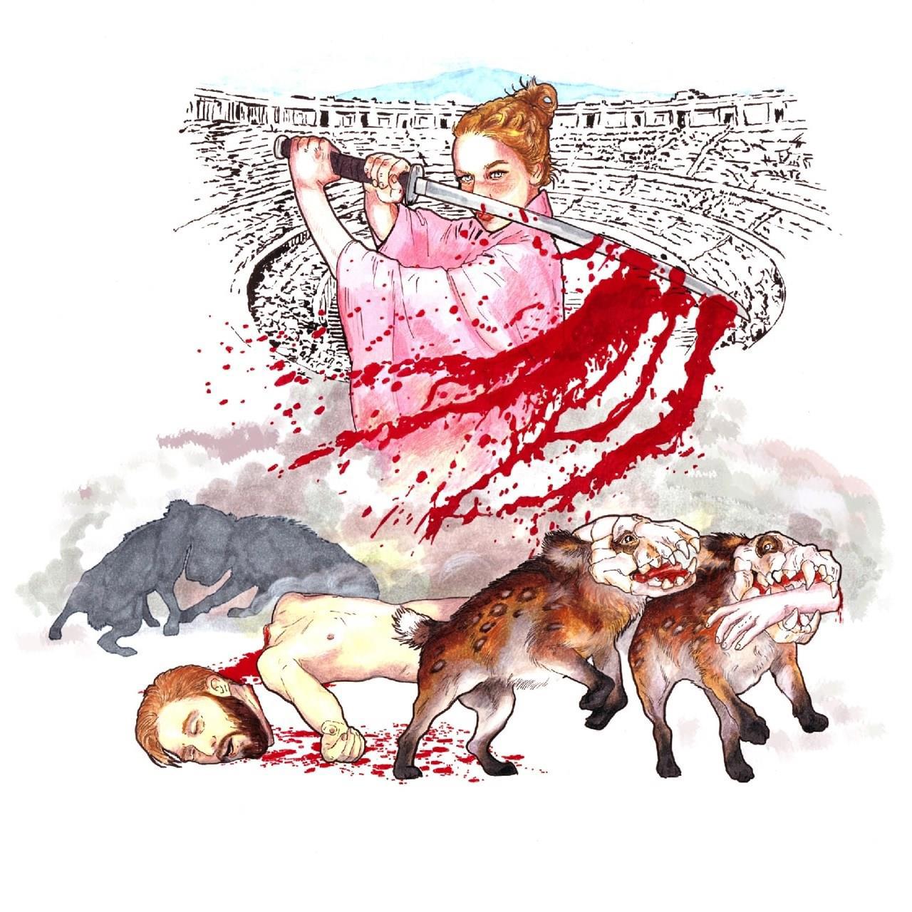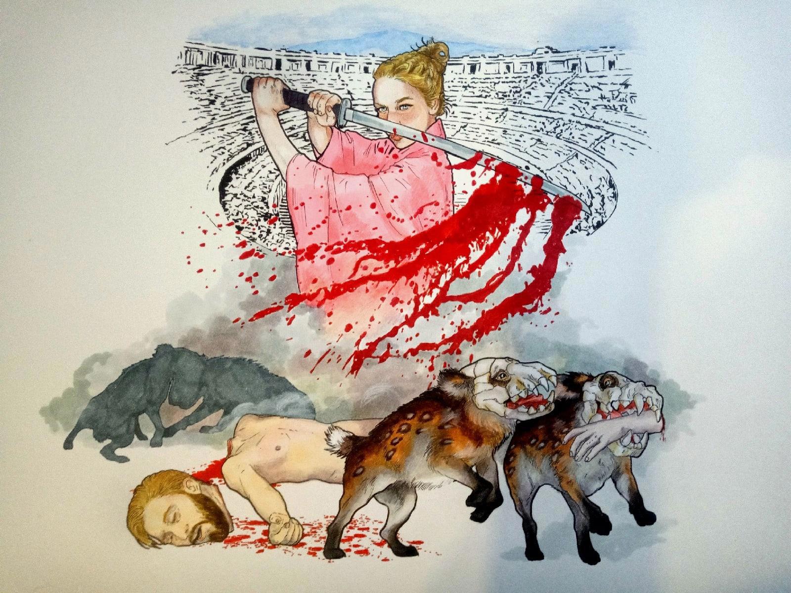 Но тут художника трясанула неудовлетворённость. К тому же Соня отвлеклась на сборку ветбредней, а Юля, оставшись без орлиного бдения редактора - БАЦ! - и присылает мне новый рисунок казни на арене...