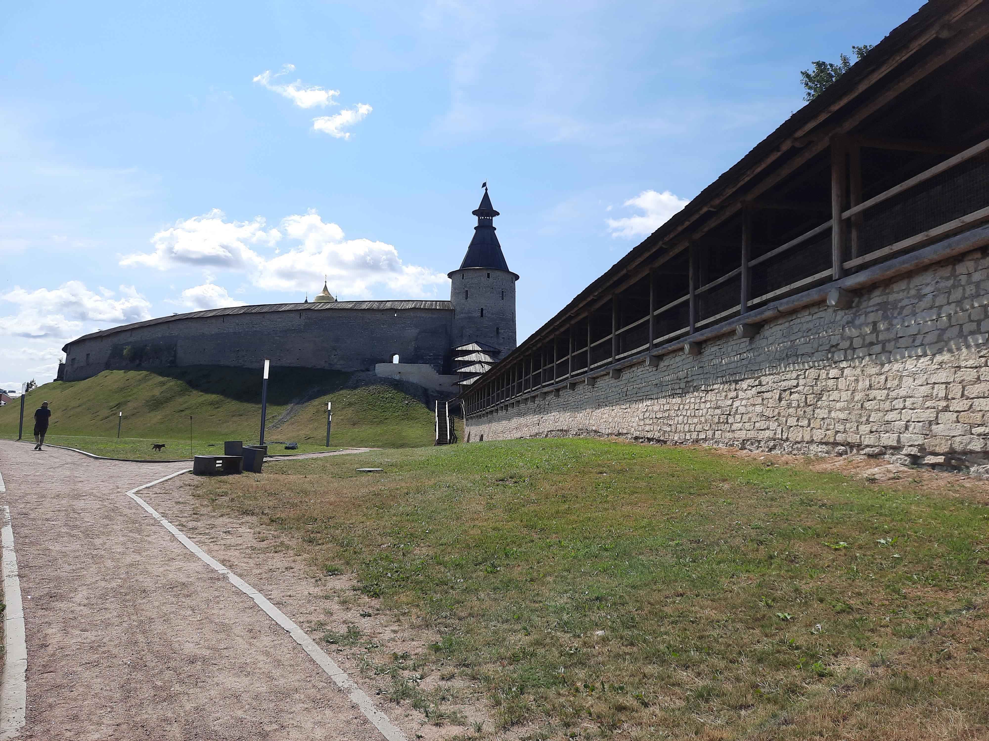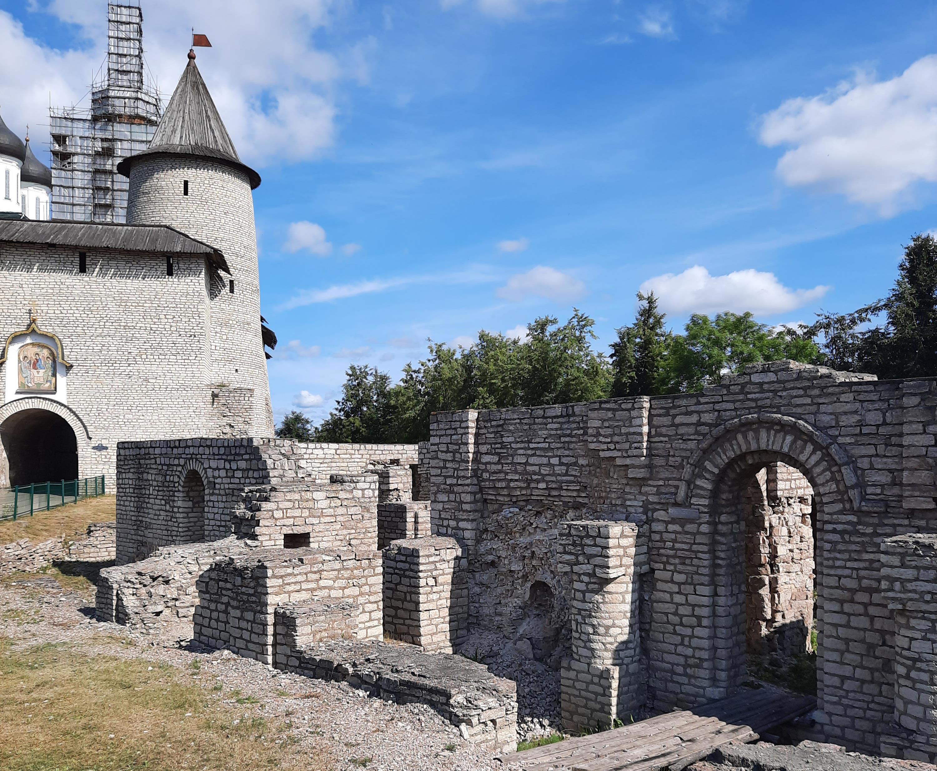 Рядом с Кромом, так еще называют кремль, раньше был Довмонтов город, от которого остались одни фундаменты, которые тоже ограждены внушительными стенами. Раньше тут был административный центр, в основном состоящий из храмов и церквей. Но что-то пошло не так, так что остались одни основания.