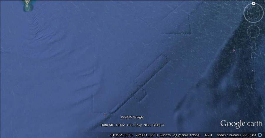 А если с этим вопросом несколько углубиться, в смысле в океан, то сверху видно, что на мелководье поверхность воды скрывает ещё что-то. И этого чего-то очень много. Настолько, что осадочные породы это ещё не успели всё скрыть. Но только вот... а что это? И кто это построил на берегу океана? Порт? Крепость? И это тоже построил в 1881 Инженерным корпусом армии США? Тогда почему об этом не сохранилось данных в архивах?
