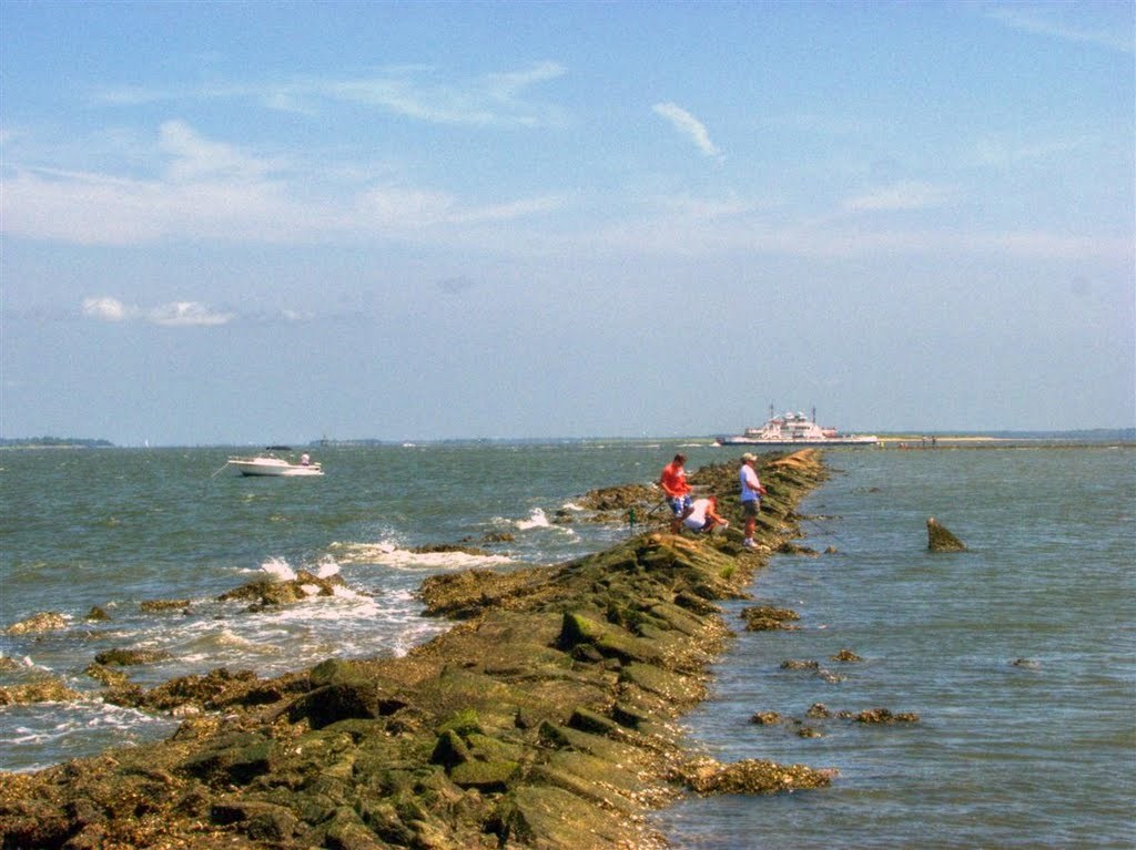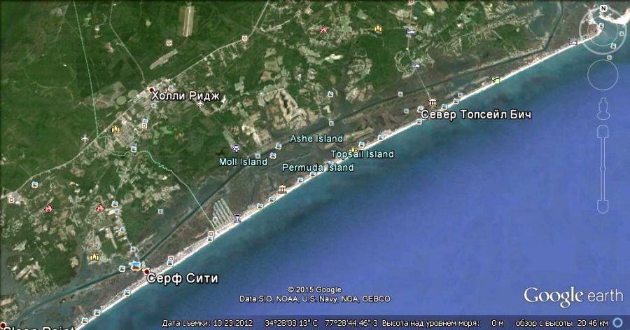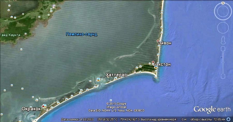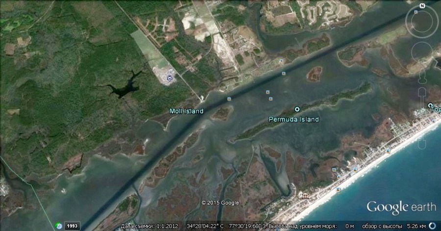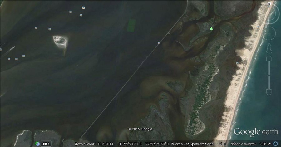 Есть там на восточном побережье, в штате Северная Каролина одно очень любопытное место. И там тоже каменные плиты на берегу. То есть в этом нет никаких сомнений — действительно сделано руками людей. Там вообще много чего люди своими руками понаделали. И даже называют время строительства и не только время, но и причину. Так и говорят, что, мол, вот эта дамба была построена в 1881 Инженерным корпусом армии США году для целей навигации. Э-э-э... может я слабо разбираюсь в навигации, но всегда считал, что для целей навигации лучше подходят какие-то заметные издаля объекты... горы например. А если что-то и строить, то намного привычнее был бы маяк. Но заходить в чужой монастырь со своими правилами как-то не очень приветствуется. Может американцам так и лучше. Давайте просто посмотрим на это чудо навигационной мысли: