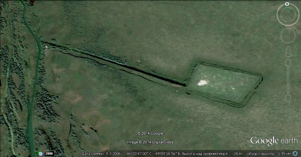 На что она похожа? Да очень просто, собственно. Перед нами так называемая «обваловка». Это когда половодье вдруг превышает привычные рамки и люди бросаются сломя голову совершать героические земляные работы, чтобы остановить пребывающую воду. Хозяйство-то спасать нужно. Такая обваловка задерживает поток, но вода всё равно просачивается и с другой стороны вала всегда возникают большие лужи. Вот это самое здесь и есть. Отличие всего одно – циклопические размеры гидротехнического сооружения. Вот так она выглядит с земли: