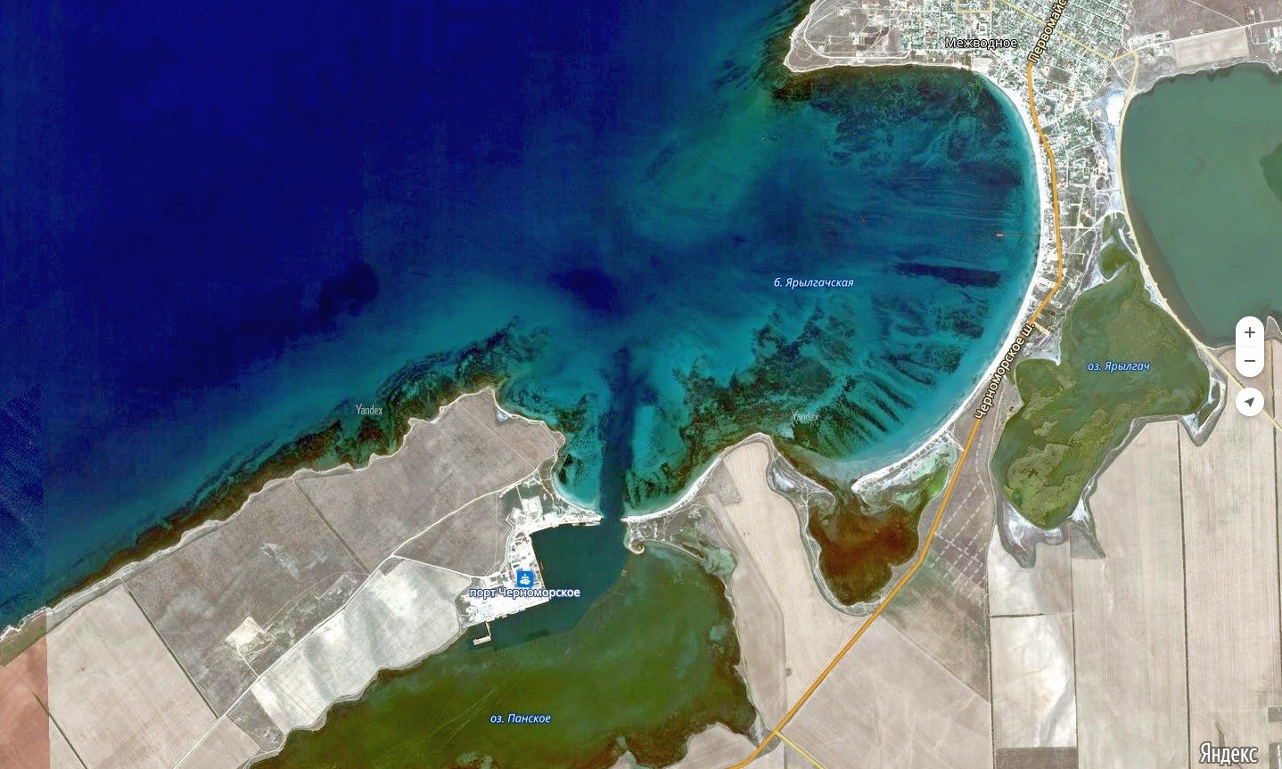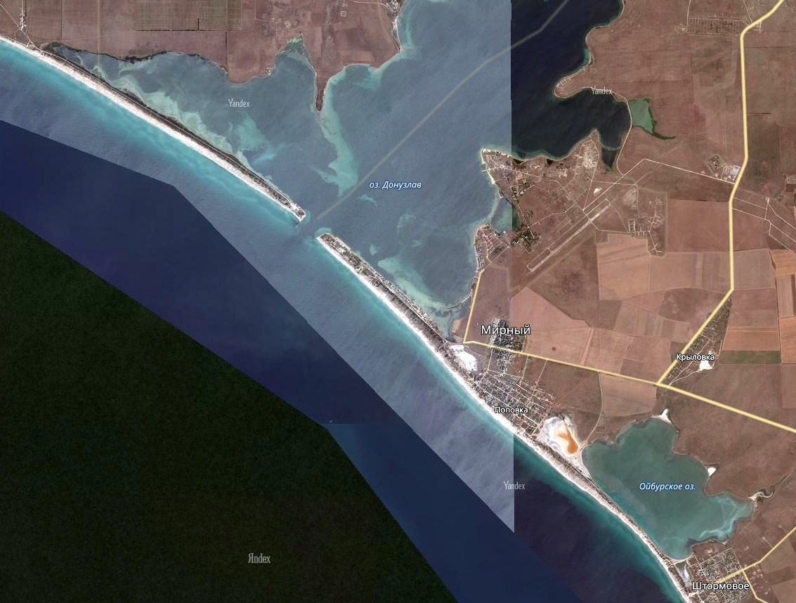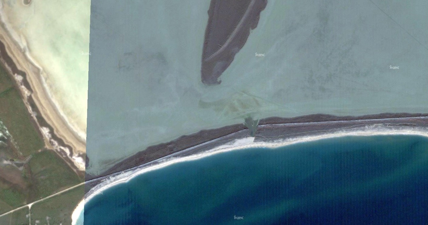 И путь можно продолжить уже за пределы полуострова, но картинка не изменится. Вот такая дамба стоит южнее Одессы. И в ней есть промоина на южной части дамбы: