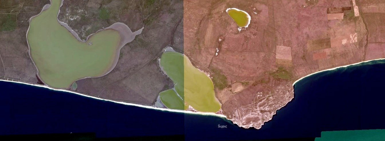 Так что это? Опять игра природы? То есть пришла такая вся крутая «природа» да и насыпала зачем-то песка поперёк потока воды, а наглая вода природу не послушалась, взяла, да и размыла вал. Вы готовы в это поверить? Я как-то не очень. Но пойдём дальше на запад и на юг по Крымскому бережку, обращая внимание на очень странную форму этого берега местами – как будто его по радиусу рисовали. И вдоль всего побережья следы такой же обваловки с промоинами и без оных. И лужи за этими валами как положено имеются – никуда не делись. Вот фотки с орбиты: