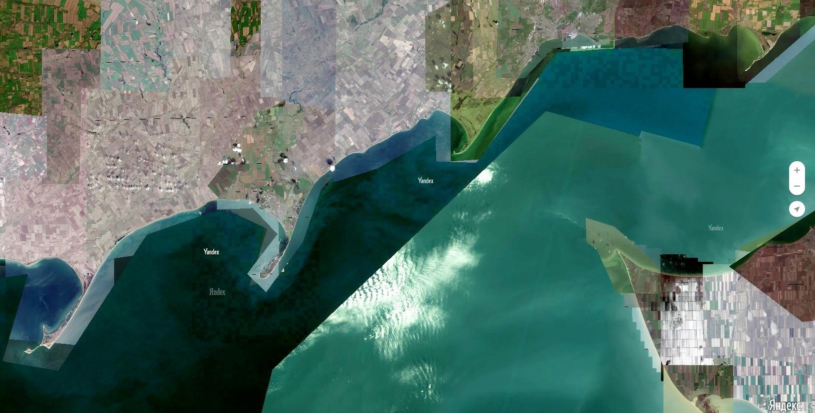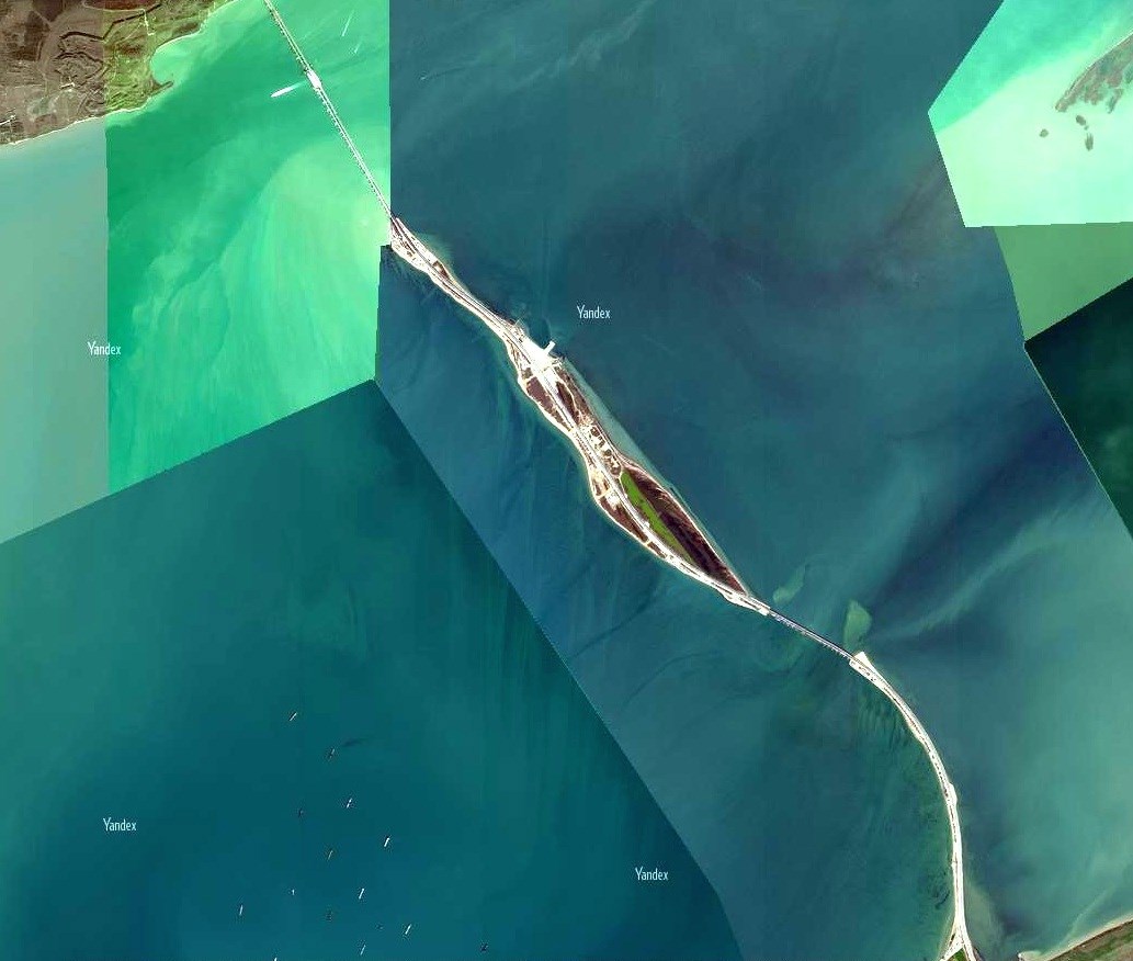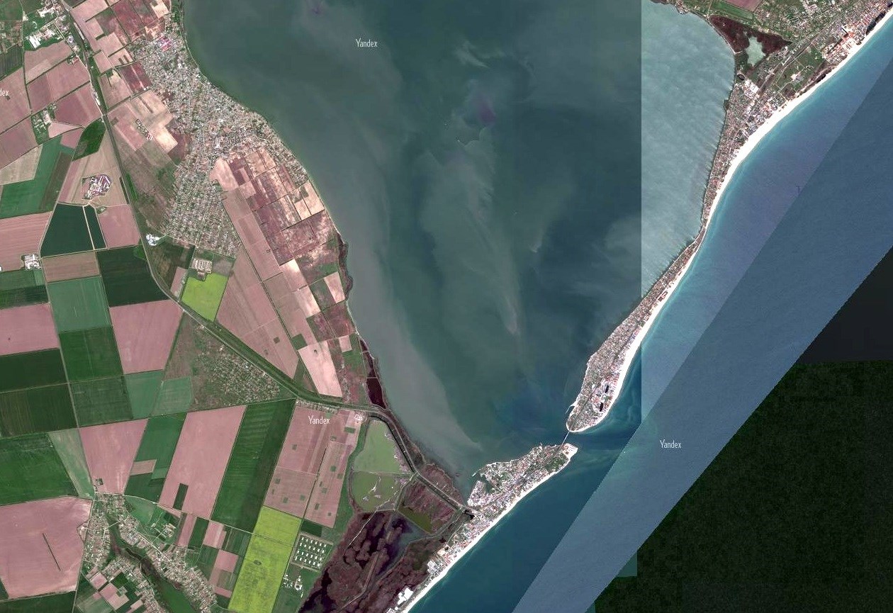 Вот, например, наш горячо любимый Крымский мост, а под ним многострадальная коса Тузла. На космической карте отлично видно, что коса идёт поперёк потока воды и эта самая вода этот песчаный вал когда-то размыла-таки в двух местах. Потом самое интенсивное течение пошло по западной промоине: