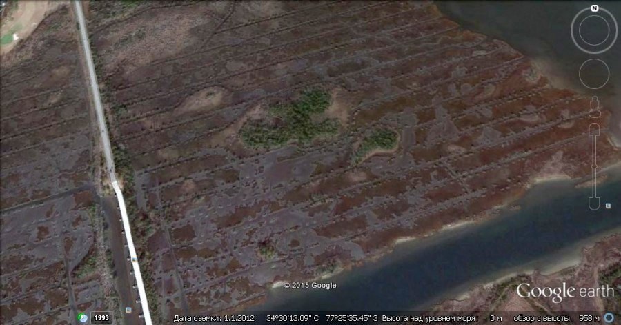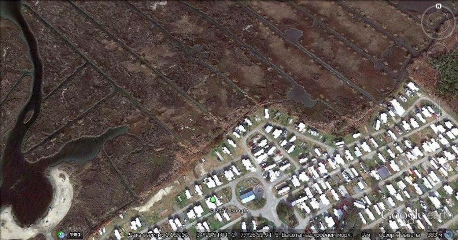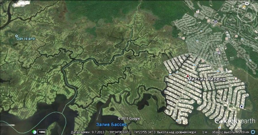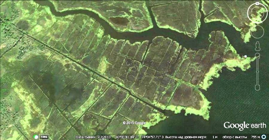Вернёмся в Америку. Если продвигаться дальше на север вдоль побережья, то можно наткнуться на странные заболоченные места, которые несут на себе чёткие следы пребывания здесь людей в не очень далёком прошлом. То есть не более 100-200 лет. Частично они в наше время начали использоваться вновь. Яркий пример – городок с говорящим названием Мистик Айленд. Райское местечко для людей, влюблённых в воду. Вместо улиц и переулков – каналы. Всё это являет собой очень своеобразную картинку с высоты и явно заметно, что обжитое пространство раньше было значительно больше. Действительно Мистик: