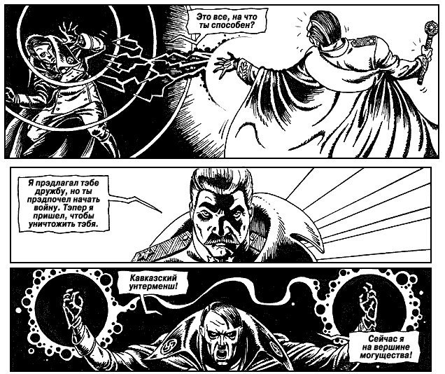 Мешанина узнаваемых исторических событий, показанных через призму фэнтези лично у меня не вызвала каких-либо сопереживаний героям, которые больше походили на уличные шаржи Жукова, Шапошников, Тимошенко, Черчилля, Рузвельта, Берии, Гитлера, Паулюса, Манштейна, Рокоссовского, Вейхса, Кессельринга, Гимлера и прочих.
