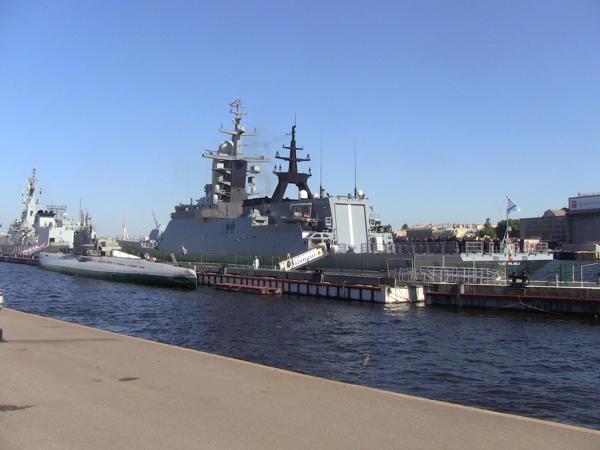 А это наш корвет "Бойкий" проекта 20380, стоит позади пакистанца. Он был также построен в Питере на судостроительном заводе «Северная верфь». Введен в строй 16 мая 2013 года.