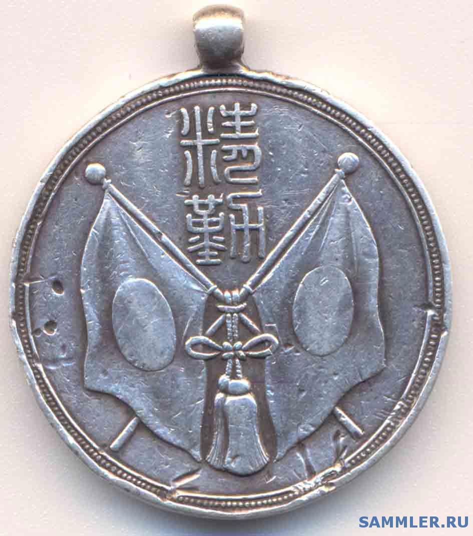 «На лицевой стороне этой медали, серебряной, изображены два скрещенных знамени, скрепленных шнуровой перевязью со свисающими кистями, и надпись иероглифами «сэйкин», означающая «прилежание, трудолюбие». Реверс этой серебряной наградной медали совершенно загадочен. Сверху и снизу пятиконечной звезды по-японски и по-русски написано «Наросино».