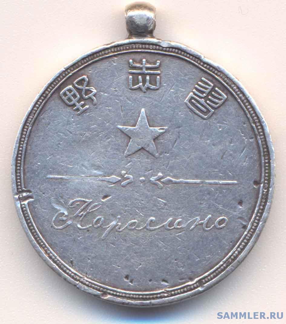 Наросино – название огромного лагеря для русских военнопленных – нижних чинов на Японских островах. Там содержались плененные в Порт-Артуре, Корее и в Цусимском морском сражении. Офицеры содержались в других местах и пользовались определенной свободой. Официально лагерь Наросино назывался «приютом», поскольку слова «концлагерь» тогда еще не придумали. Такими медалями японцы награждали особо примерных в поведении военнопленных, старост бараков, которые помогали лагерным властям поддерживать должный порядок в Наросино.