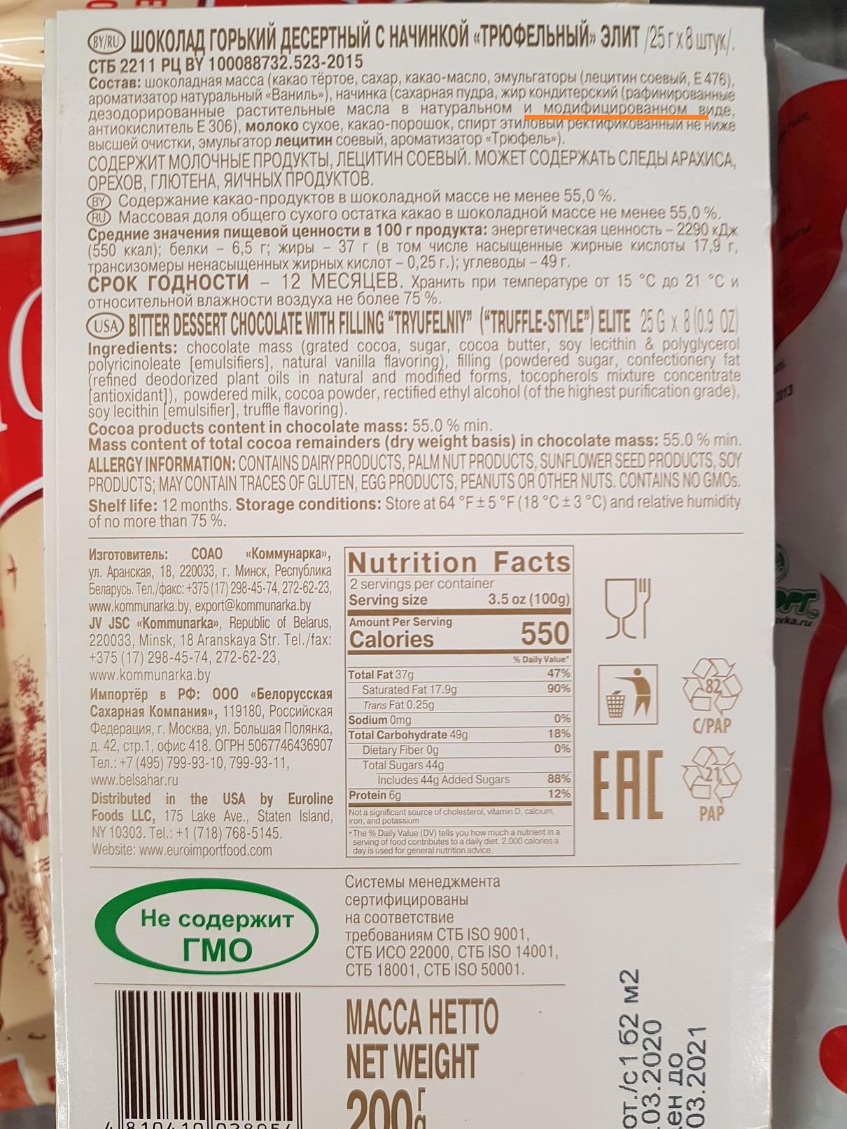 Первый пример - шоколад элитный. Видим на упаковке яркую надпись "Не содержит ГМО". Читаем состав и первое на что натыкаемся - это содержание сои. Кто следит за "успехами"сельского хозяйства, знает, что натуральной сои почти не осталось. Американская компания «Монсанто», специализирующаяся на генных модификациях, давно покорила соевый натурализм. Крупные компании не имеют возможности закупать чистую сою, ибо чистая осталась только где-то на частных фазендах. В масштабах производства давно используется соя, "вышедшая" из ворот американской компании.