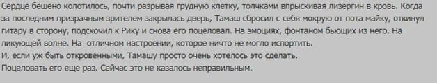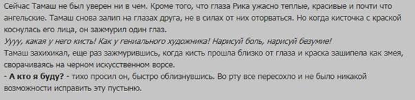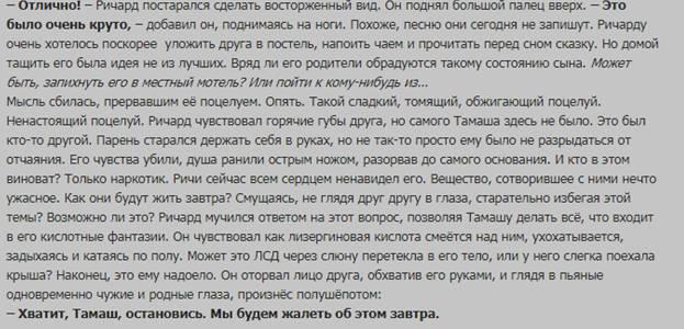 Всё закончилось тем, что мы заигрались. Точнее, это я заигралась. Игра стала заменять жизнь, персонажи стали реальными, а мой соигрок ко всему прочему вёл двойную игру и в соцсетях выдавая себя за другого персонажа. Наверное, у меня никогда не получится передать всё, что я переживала в то время, словами. Но мне это сейчас и не нужно – я постаралась сделать это в книге, внеся в неё всё, что можно было внести: два парня, крутящие любовь, при этом не являющимися представителями нетрадиционной ориентации, рок-музыку, большой обман от одного из них, наивность и веру в чудо от другого. И много символов, понятных только мне самой и... может быть... моему соигроку. Но он никогда не прочтёт эту книгу. И всё равно я мысленно я посвящаю книгу ему – точнее, ей.