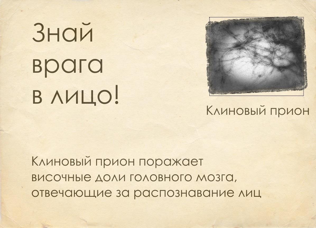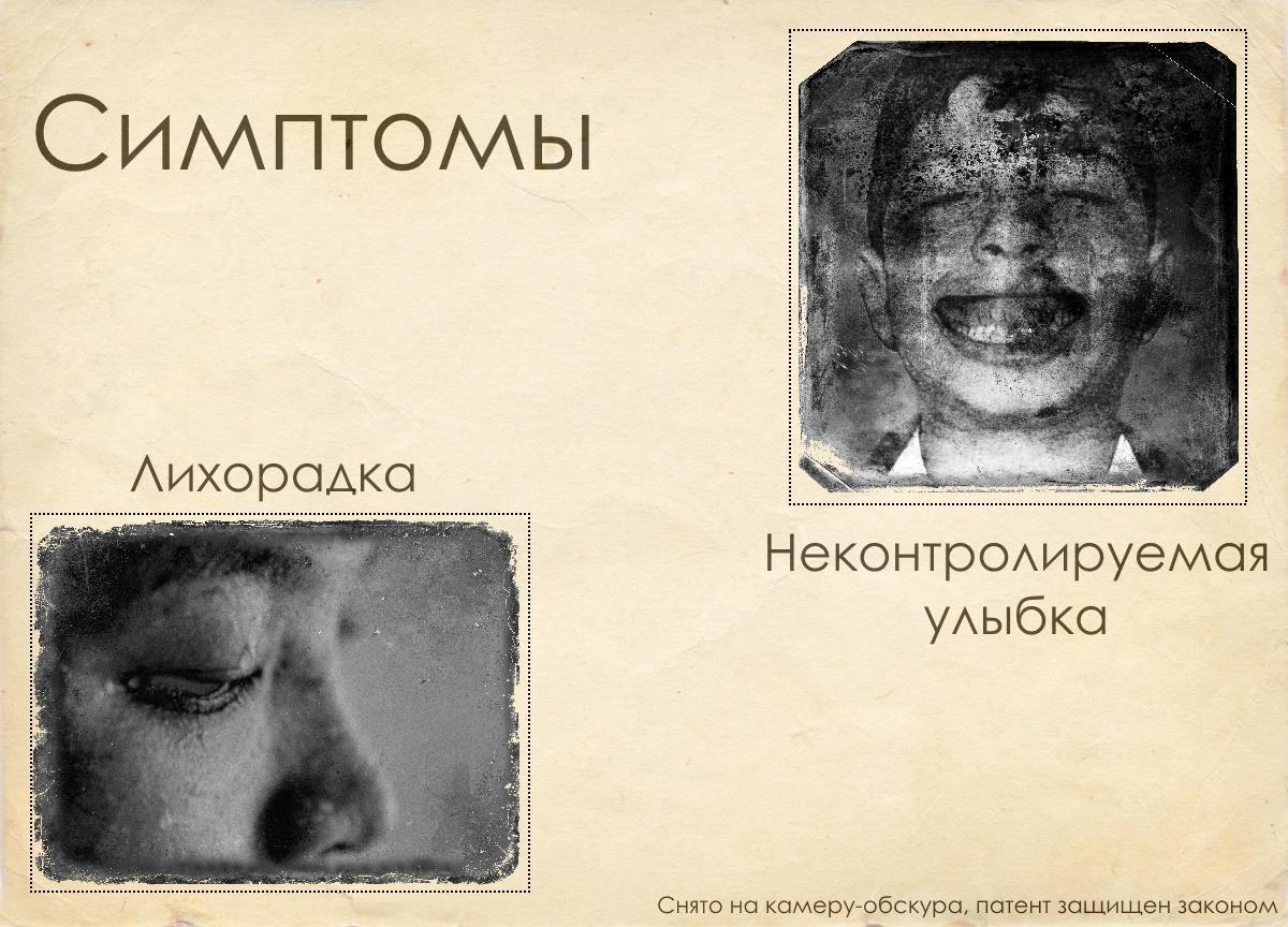 Практика показывает, что зрительный контакт, установленный с улыбающимися зараженными (последняя стадия заражения) наиболее опасен и приводит к гарантированному заражению прионом. Помни: обо всех улыбающихся людях немедленно докладывай сотрудникам сил ГСО или в ближайший мобильный госпиталь.
