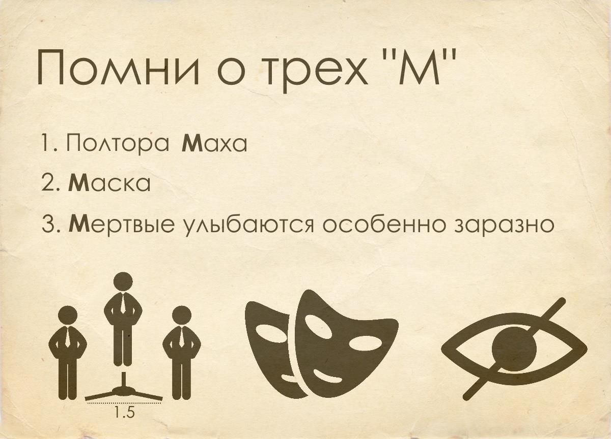 1. Соблюдай дистанцию в полтора маха. Как правило, такого расстояния достаточно для того, чтобы мозг не сумел распознать в маске человеческие черты лица. Подходя к кому-либо ближе, чем на это расстояние, ты подвергаешь себя и других смертельной опасности.