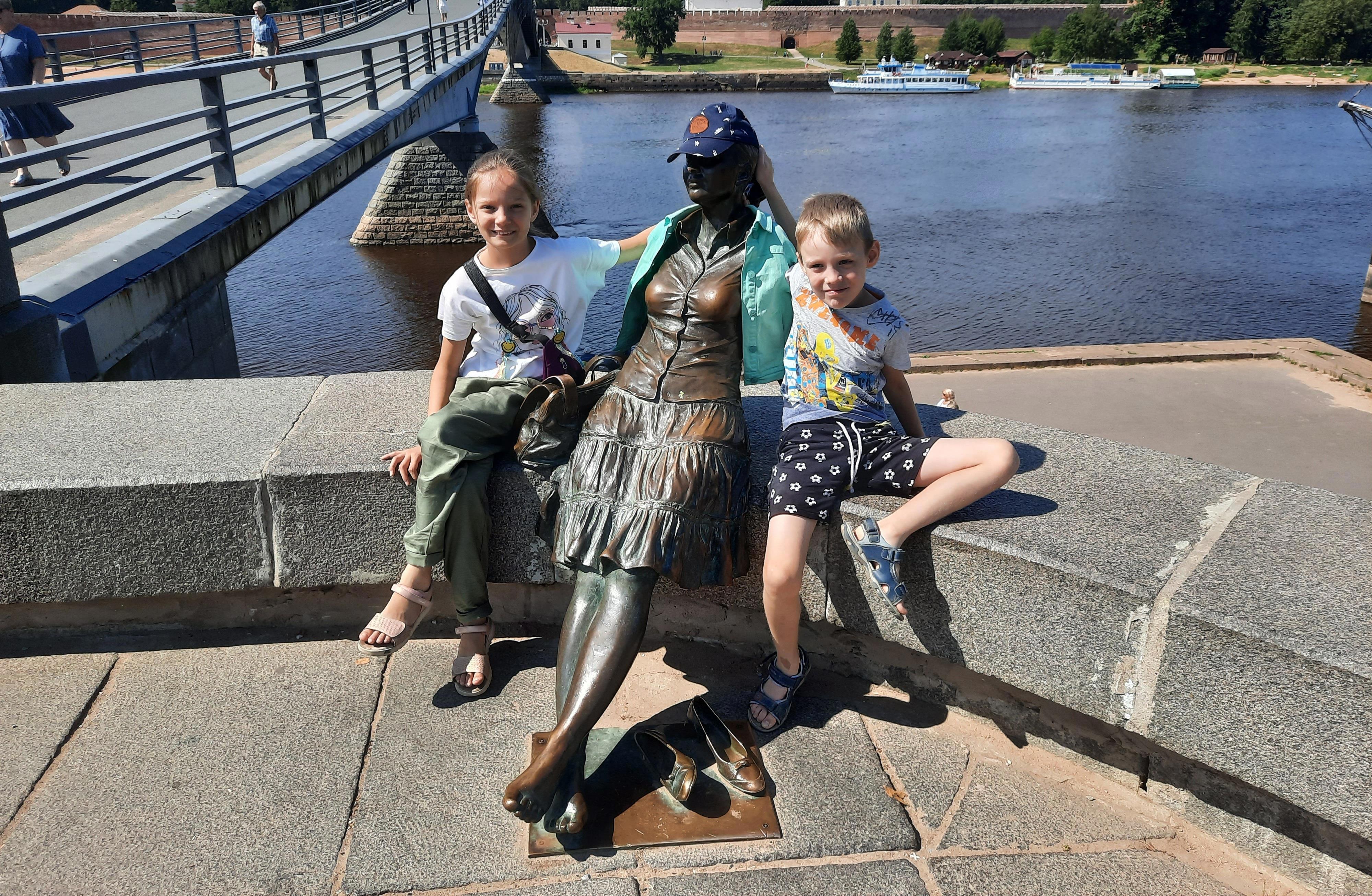Вот, пусть не голодает новгородский люд, а ест щи, блины и пельмени с начинкой из кабачков. Дальше, нашли мы памятник туристке, которая сидела и грустила рядом с мостом. Подсели мы рядом и приодели бедняжку с барского плеча.