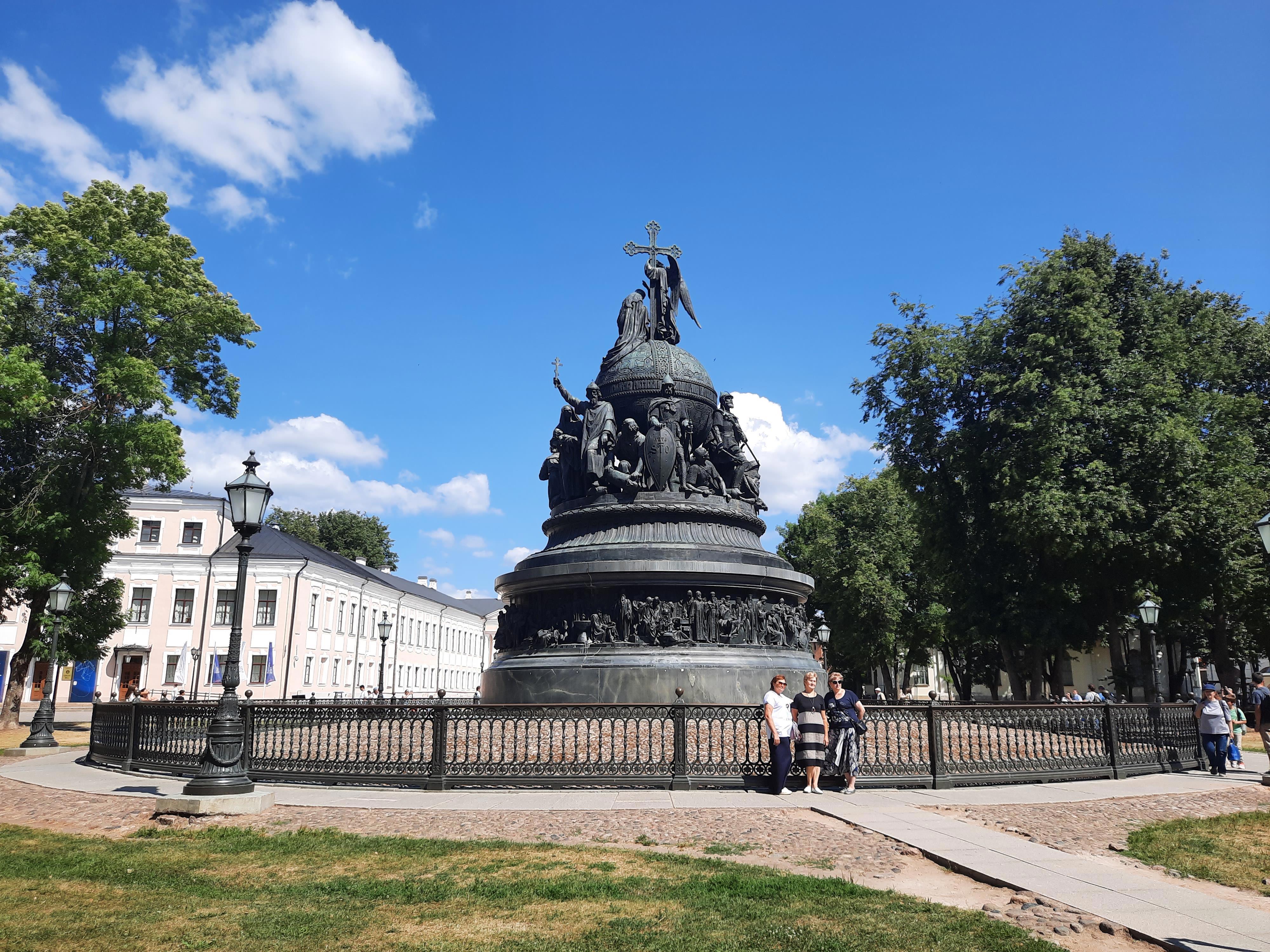 Самая узнаваемая достопримечательность в Детинце, это конечно памятник Тысячелетие России. Он установлен в 1857 году, сами догадайтесь почему. Открывал памятник сам император Александр ll. Немцы пытались его вывести в 1944 году, но у них ничего не получилось. Наши и Новгород отбили и памятник назад вернули, правда уже изрядно подпорченный. Пришлось реконструировать. Фотографией памятника вы могли полюбоваться в самом начале моего повествования.