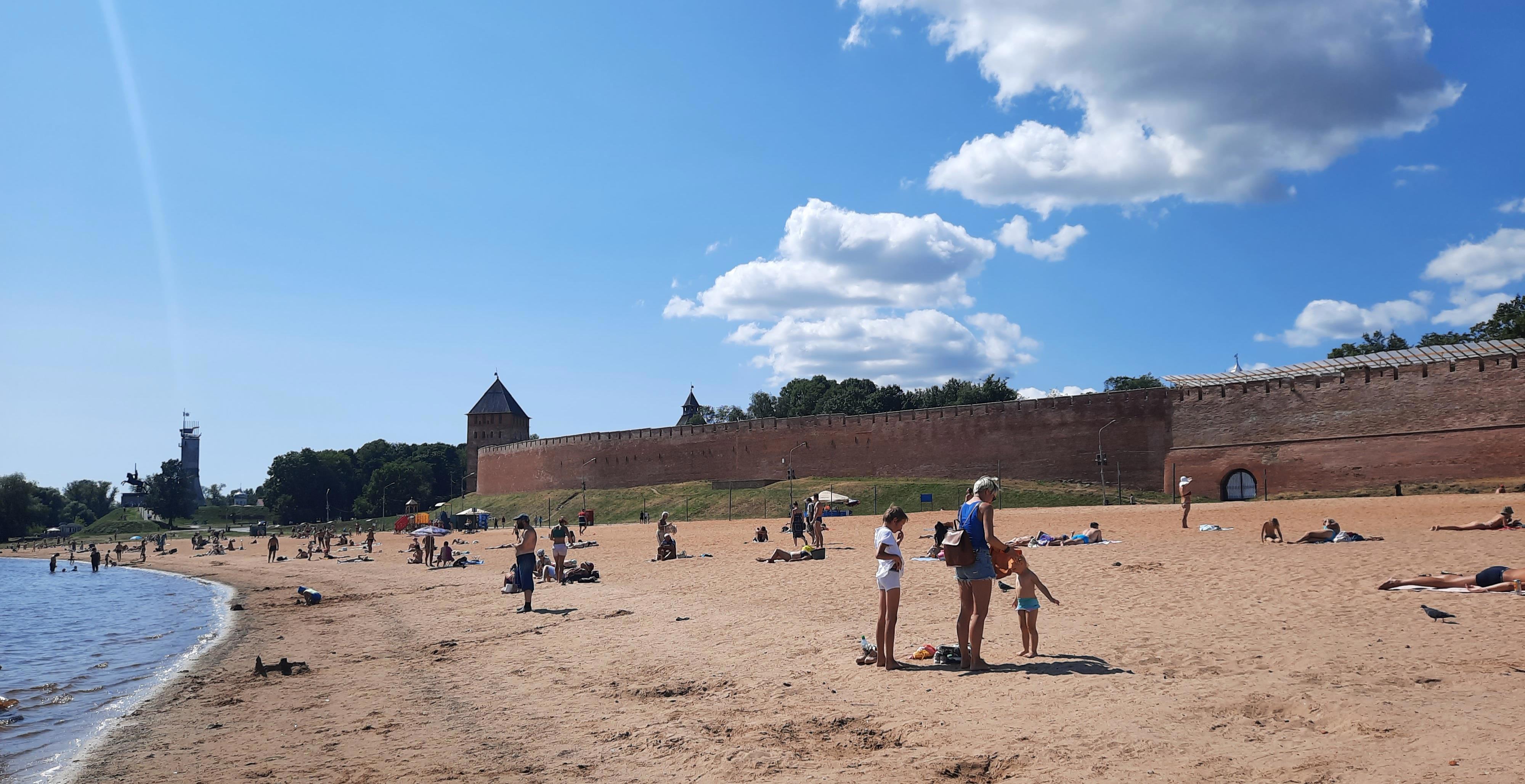 Прибежали мастера русские и совсем не русские, да застучали перфораторы и отбойные молотки, засверлили дрели, закричали прорабы: «Хули вы сидите, давайте ,сука, работать!». И стали видны изменения не по годам, а по часам. Пока суть да стройка, я пошел на пляж, благо он под стенами кремля на берегу реки Волхов. Посмотрел я на право, там люди отдыхают, мамаши с детьми играют