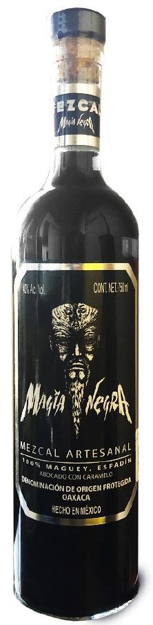 Итак, Magia Negra Mezcal Artesanal (abocado con caramelo): «золотой» мескаль «Черная магия», проходит через процесс «абокадо» с применением карамельного тростникового сахара. 100% спиртов агавы, 40% алк., короткая выдержка в дубовых бочках. Производится в мексиканском штате Оахака. Цвет очень насыщенный, даже темнее, чем «коньячный». Если не смотреть на просвет, бутылка с этим мескалем выглядит вообще совершенно черной, хоть и сделана из бесцветного прозрачного стекла. Черная магия, однако! В бокалах / рюмках мескаль этот тоже выглядит практически черным, с легким красновато-фиолетовым отливом. Этикетка соответствующая: черная с серебром, со стилизованной физиономией злобного колдуна. Это мескаль ручной (кустарной) работы («artesanal»), и производится он не из голубой, а из так называемой Американской агавы, что и указано на этикетке. Тут, кстати, имеется любопытная игра слов. Американская агава (она же пита или магуэй) по-испански называется maguey, что созвучно и отчасти сходно по написанию со словом «магия» (magia), а во втором своем значении означает «опьянение» (мескалём) или «священное опьянение».