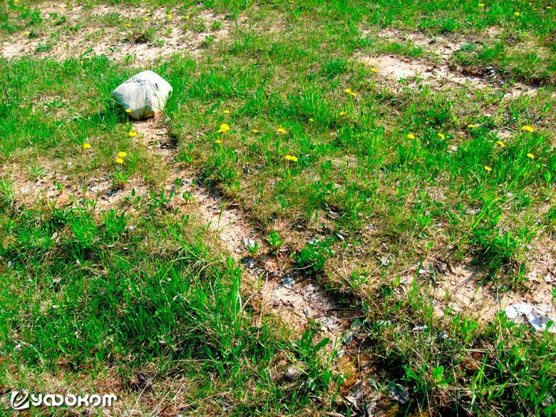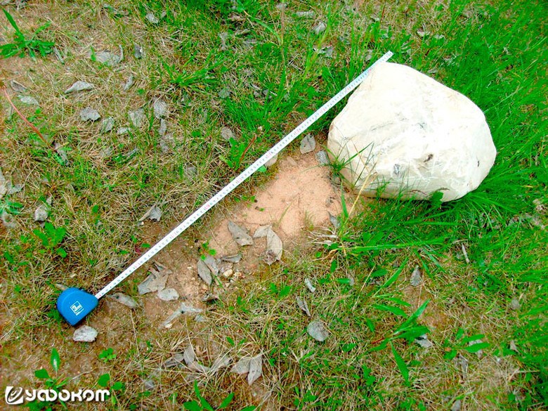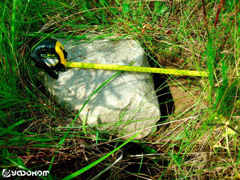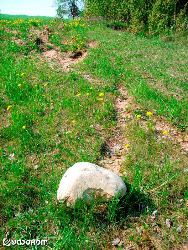 На этот раз никаких «мёртвых озёр» и прочего – место вполне себе нормальное для средней полосы. Кругом трава и след тоже ей начал порастать. Может поэтому никто особо и не обратил на это чудо своего внимания. Видимая длина следа около трёх метров. Ещё автор отметил наличие валика из грунта перед камнем по ходу движения, что исключает возможность предположить, что камень просто скатился сверху. Именно по этой траве автор и сделал предположение, что движение происходило зимой или весной. Он не успокоился, ещё побродил вокруг обнаружил ещё такие же следы. Дальше только версии. Сам автор предположил, что камень просто соскользнул по оттаявшему грунту со склона… может быть. Однако, вы много видели камней, которые сами собой по весне начинают скользить вниз по склону без внешних причин?