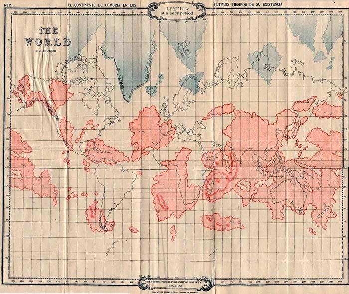 Карта Лемурии в ее поздний период, изображенная поверх современного расположения материков. Приложение к первому изданию книги У. Скотта-Эллиота «История Лемурии и Атлантиды» (1896)