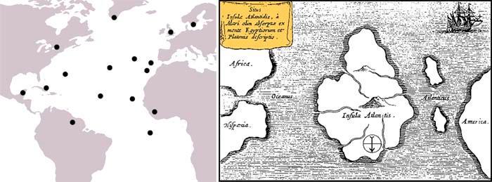 Места в Атлантическом океане, куда различные исследователи помещали Атлантиду и Карта Атлантиды Афанасия Кирхера, 1669 год