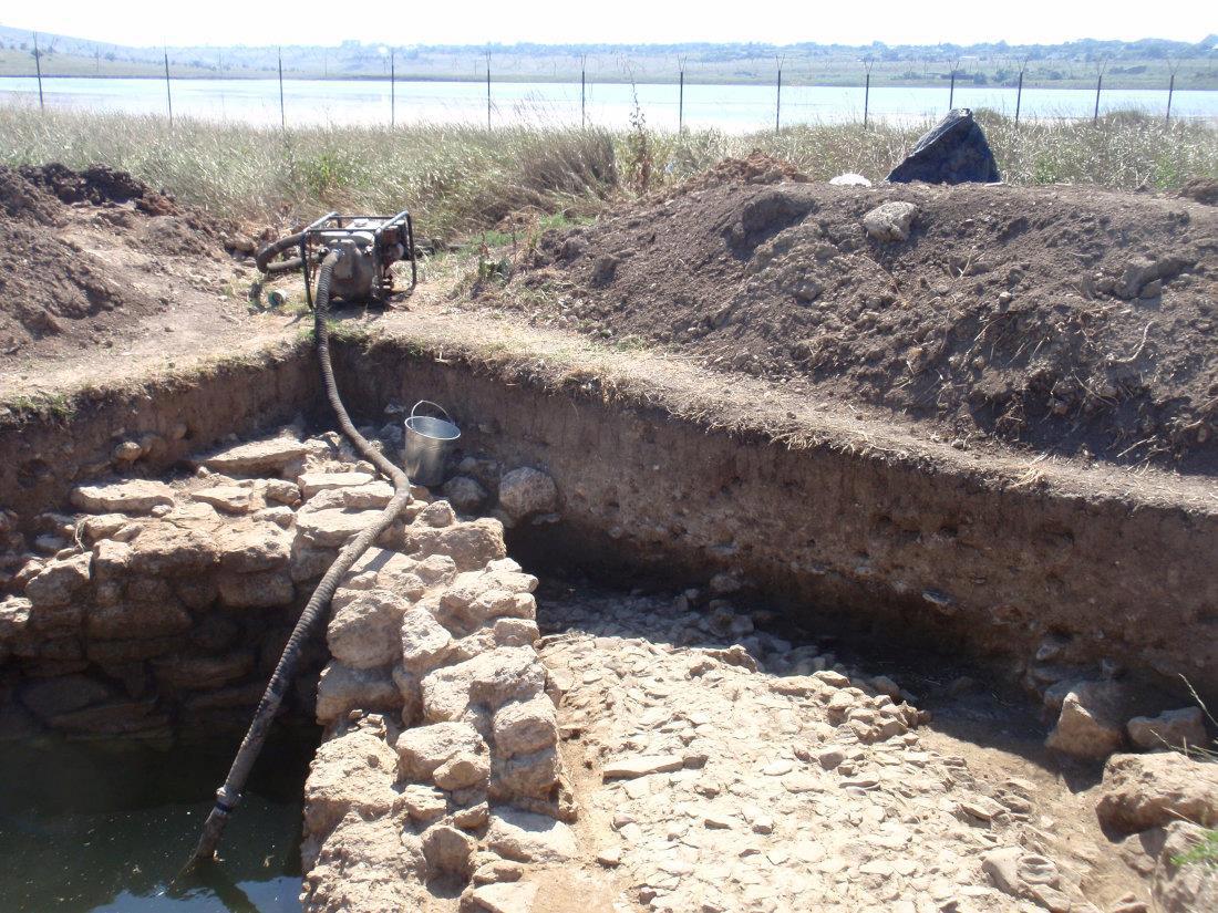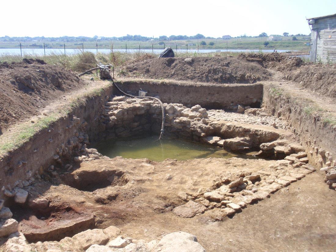 Наземный раскоп этого года с частью дома и фрагментом дороги римского периода. В прошлые года наземный раскоп был совсем на берегу, и море регулярно сносило дамбу к чертям.