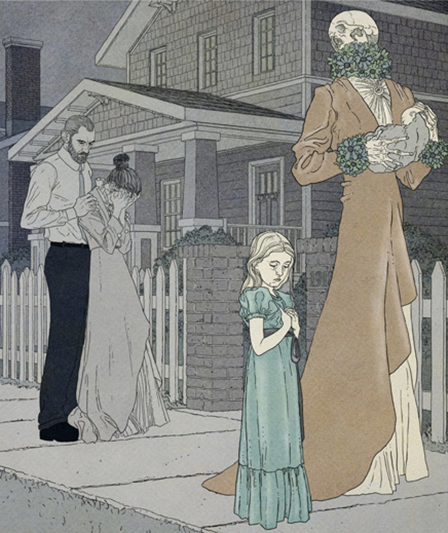 Ужас перед пандемиями уже тогда порождал множество сюжетов как в изобразительном искусстве, так и в литературе. Один из самых популярных - Danse macabre (пляска смерти), появившийся в XIV веке после пандемии чумы, унёсшей жизни едва ли не половины Европы. На средневековых гравюрах изображали Смерть, уводящей живых в царство мертвых, в облике пляшущего скелета, жнеца, охотника, шулера. На этой картине она изображена в виде нянечки с детьми (эпидемия испанского гриппа)