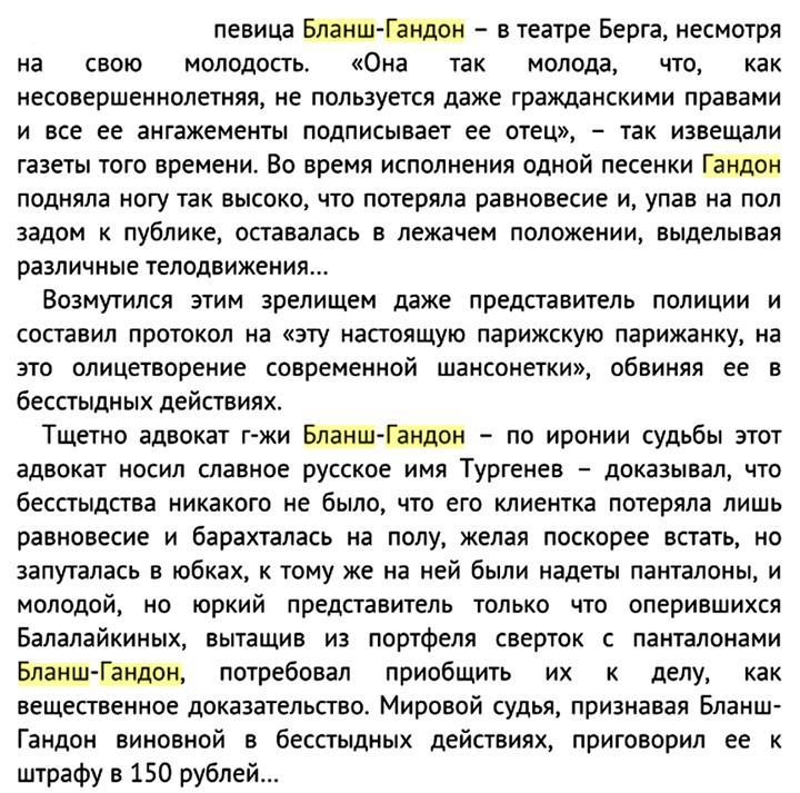 "Мы не можем упрекнуть себя в равнодушии к такому происшествию, какое случилось с артистками театра-буфф Бланш Гандон и Луизой Филиппо, из которых артистка Филиппо обвинена была в суде за то, что производила на сцене безстыдныя телодвижения, а Бланш Гандон за то, что явилась на сцену в крайне непристойном костюме".
