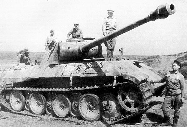 Красноармейцы осматривают танк «Пантера» (Kpfw. V Ausf. D Panther, тактический номер 312) 51-го танкового батальона (Panzer-Abteilung 51) 39-го танкового полка (Panzer-Regiment 39) 10-й танковой бригады (Panzer-Brigade 10), подбитый в ходе наступательной операции вермахта «Цитадель». Южный фас Курской дуги, июль-август 1943 года.