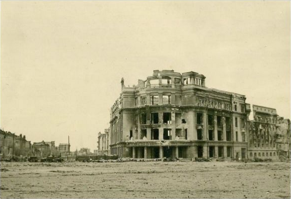 Но всё же вынуждены были отступить к Волге, и зданием Универмага овладел враг - немецкое фото с улицы Островского (с нынешнего "двора Универмага") октября 1942 года - за Универмагом виднеется то, что осталось от "Большой Сталинградской" после бомбардировки 23 августа - по сути, одна стена: