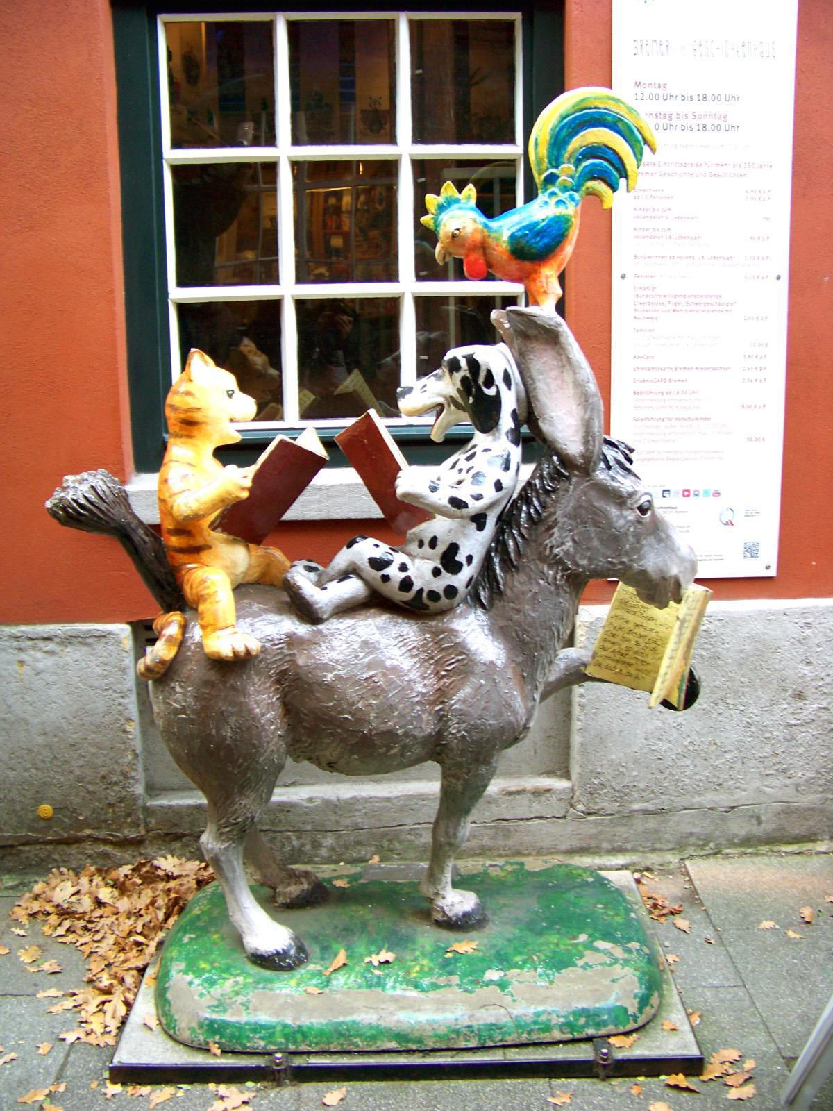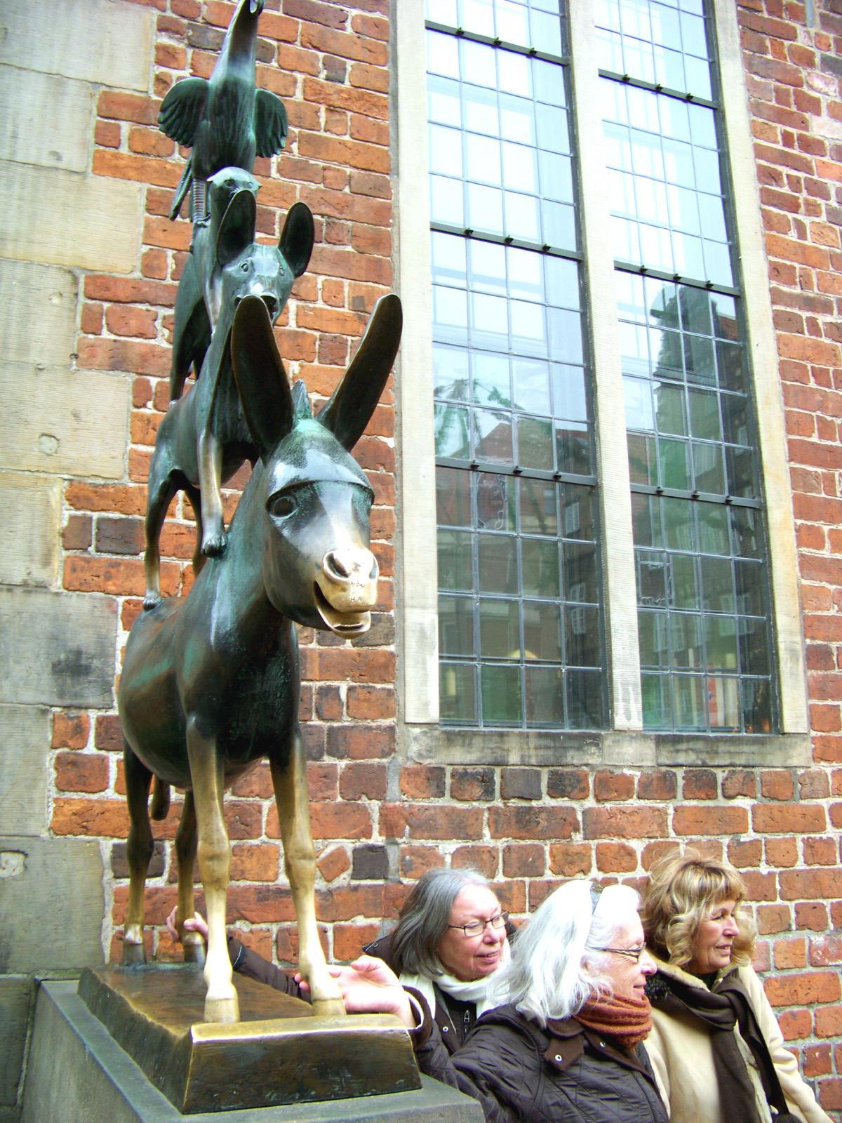 Бронзовое изваяние Бременских музыкантов работы Герхарда Маркса поставили в городе в 1953 году, возле ратуши. С тех пор это один из самых популярных туристических аттракционов города — каждый приезжий старается потереть руками ноги осла, чтобы сбылось какое-то желание. Несчастные конечности животного и его нос почти что блестят: