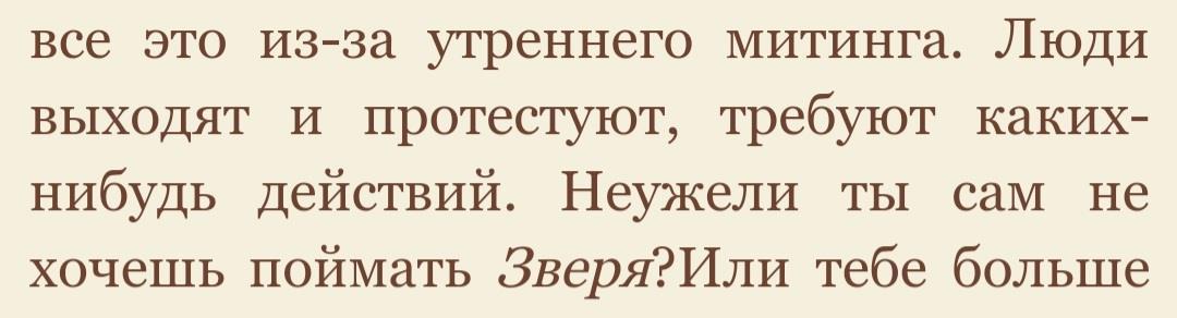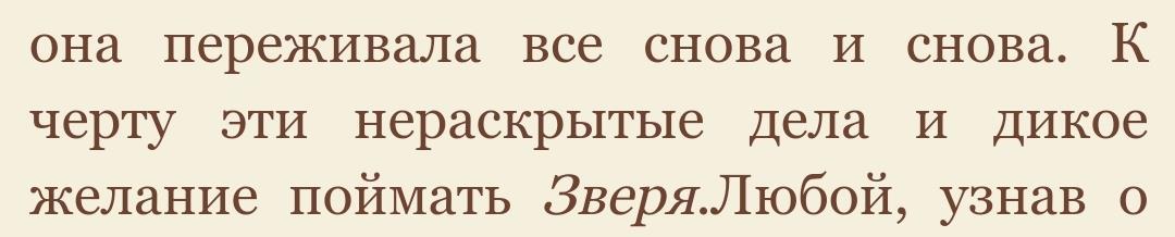 Ближе к середине книги, ты вдруг понимаешь, а где жанр детектива? Книга съезжает из разряда расследований и на первый план выходит бытовое налаживание отношений между официанткой и дефективом. Тут и семейные посиделки с мамой, проблемы семьи напарницы, которая была найдена мёртвой в ванной, проблемы друга официантки. Про Зверя, который терроризирует город и держит в страхе всех его жителей даже не упоминается. Разве что вскользь, как в сцене с судмедэкспертом.