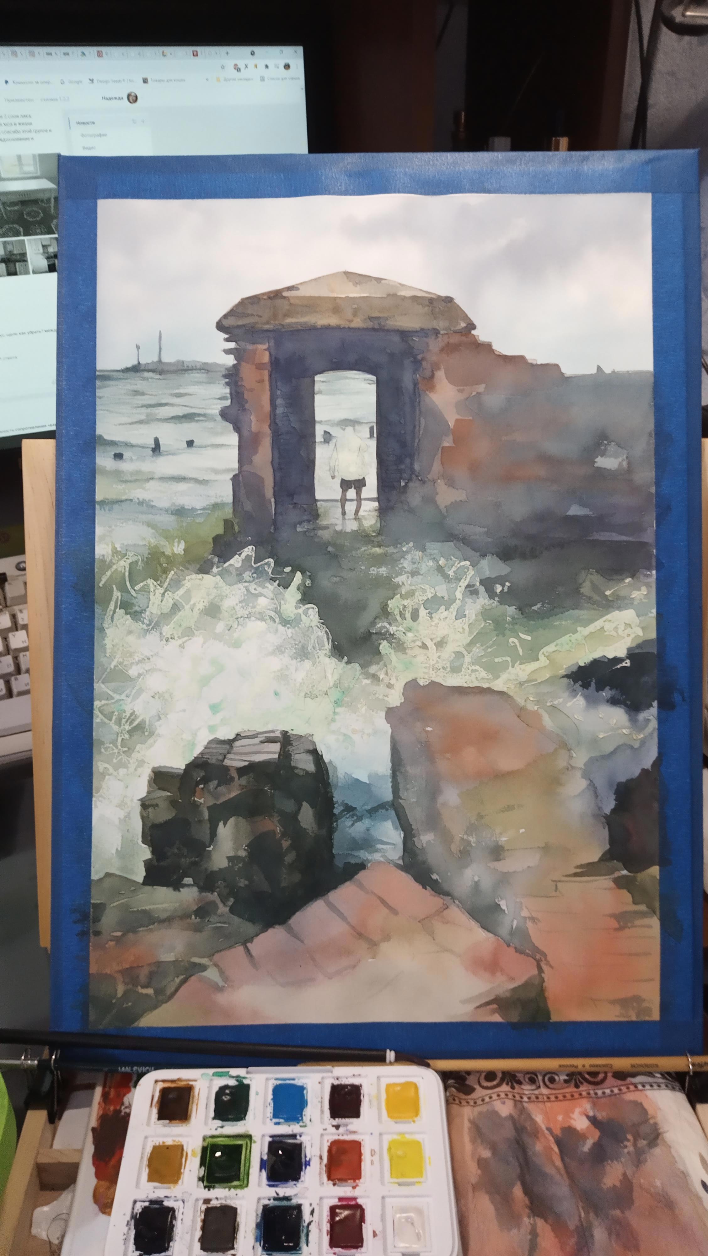Целиком всё - походным набором акварели VanGogh на 15 полукювет. Отличные краски. Считаются ученическими, как Cotman WN, но при этом существенно насыщенней. Короче, если кто выбирает между ними, выбирайте VanGogh!