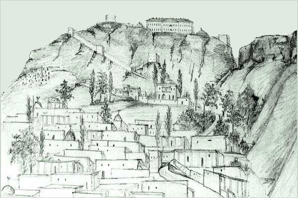 Тарки. Вид со стороны Каспийского моря. Зарисовка Д.А. Милютина.