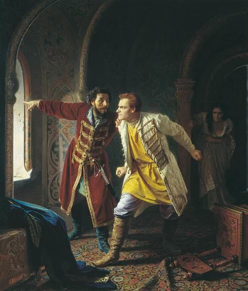 Карл Богданович Вениг «Последние минуты Дмитрия Самозванца». На картине рядом с Лжедмитрием - Петр Басманов.