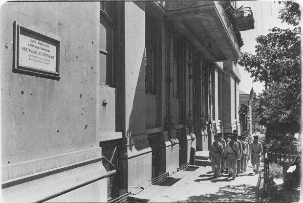 Откровенно говоря, поначалу у меня были некоторые проблемы с идентификацией довоенных или послевоенных лет на некоторых фотографиях, где не попали в кадр ни соседние здания, ни автомобили, но после внимательного изучения нашёлся один точный признак - на угловой ротонде восстановленного здания нет верхних украшений, которые были до 23 августа 1942 года: