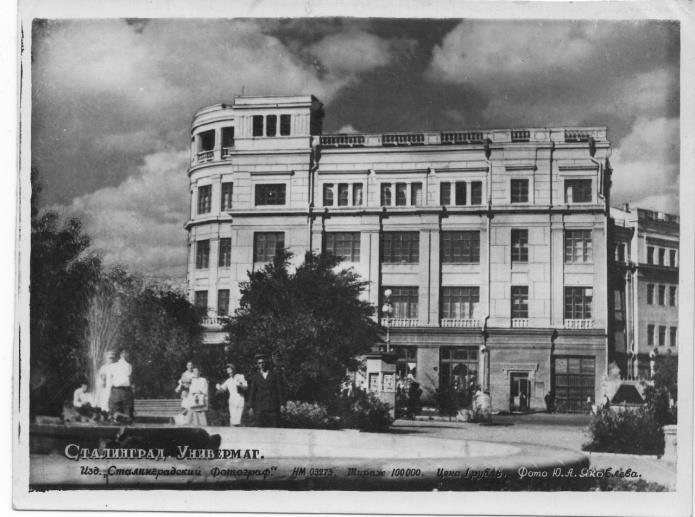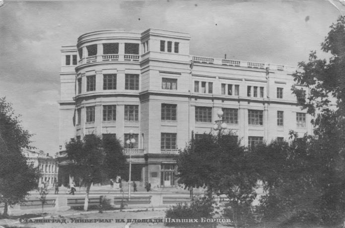 Универмаг оказался единственным зданием среди стоявших непосредственно на Площади Павших Борцов Революции до 23 августа 1942 года, которое было восстановлено - остальные восстановлению не подлежали. Даже Первый Дом Советов (бывшая царицынская гостиница "Столичные номера", её долгая и интересная история здесь - https://author.today/post/121378 ), несмотря ни на свою кладку девятнадцатого века, ни на то, что на ней ещё в довоенные годы висела табличка о том, что там во время гражданской войны жили и работали Сталин и Ворошилов (мне удалось-таки найти фото этой таблички 1942 года - до 23 августа, которое следовало бы выставить в истории гостиницы: на стене рядом с табличкой отметины от пуль ещё гражданской войны):