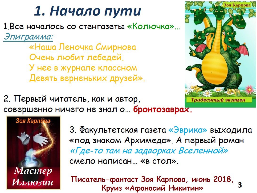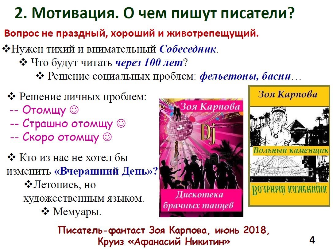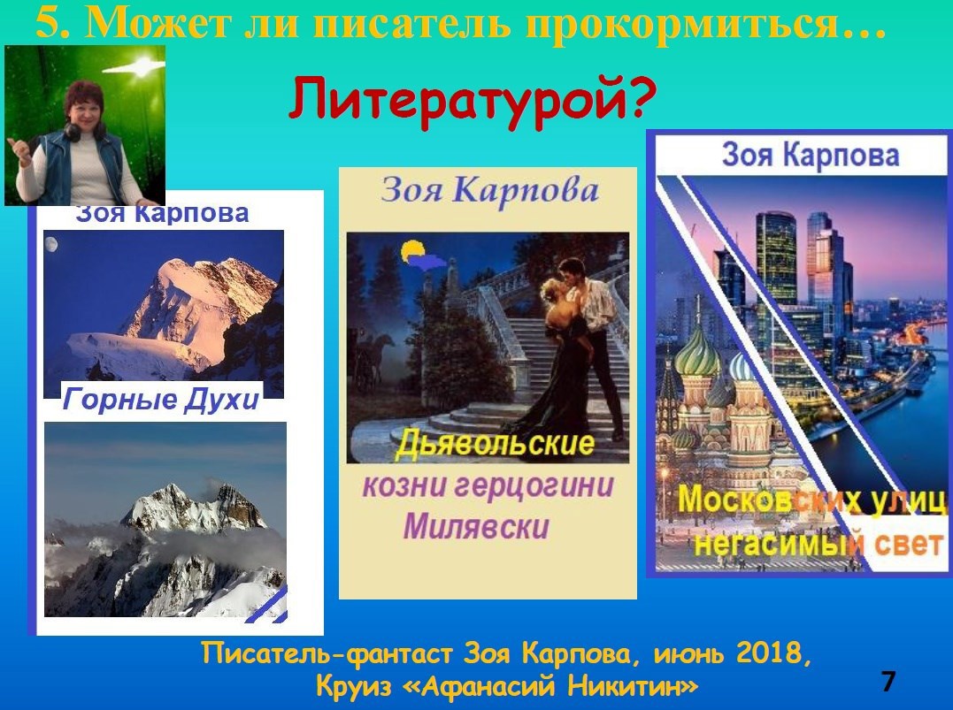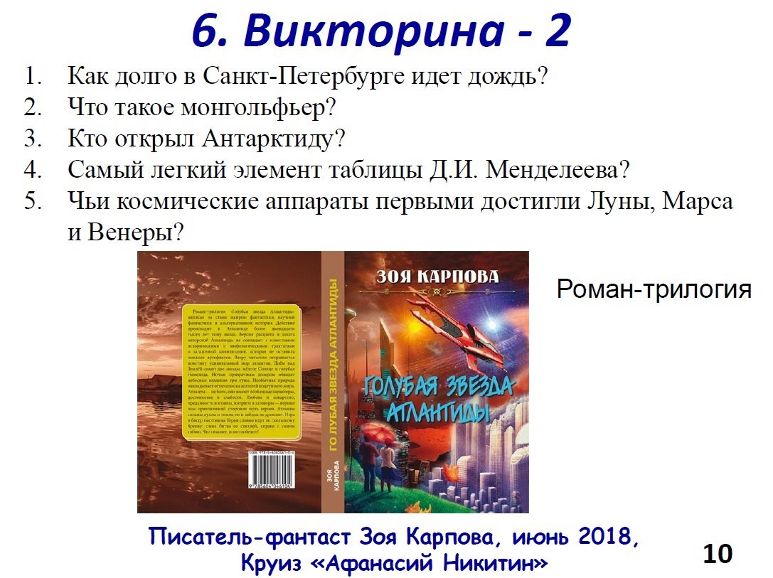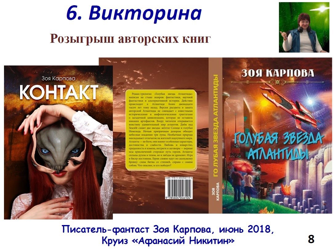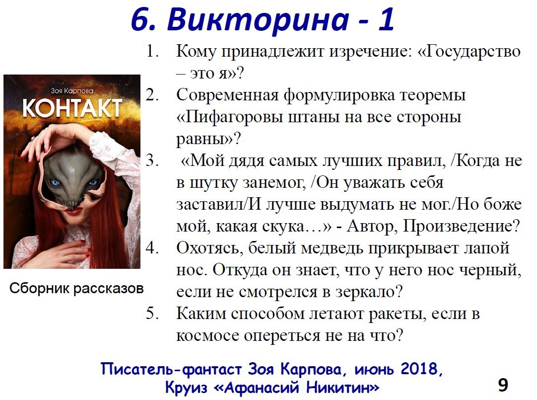 Автор: AstraОтпуск - хорошее время для встречи с читателями. А отпуск на воде, то есть в круизе на теплоходе, например, по реке Волге - еще лучшая возможность пообщаться с любителями художественной литературы живьем. Чем я и восользовалась с любезного разрешения директора круиза Романа Кормакова на теплоходе "Афанасий Никитин". Чтобы не "экать", не "мекать" и не "бекать" пришлось пару дней посидеть за ноутбуком, чтобы набросать незатейливую презентацию. И вот что получилось: