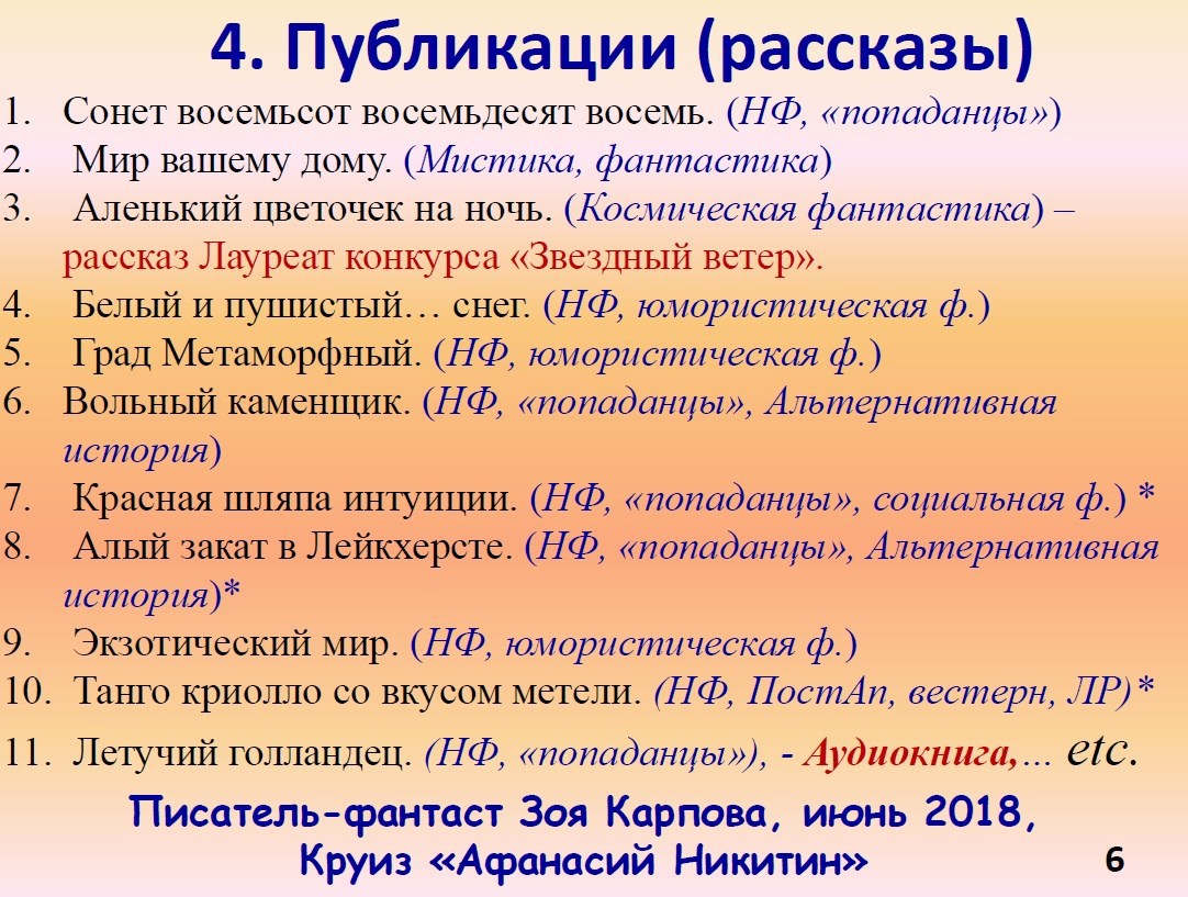 Слегка и ненавязчиво затронула жанры и поджанры, не забыв о своих любимых, в которых что-то писала. Ну и качестве примера, привела маленький список публикаций, в основном бумажных (те, что без "звездочки" *).