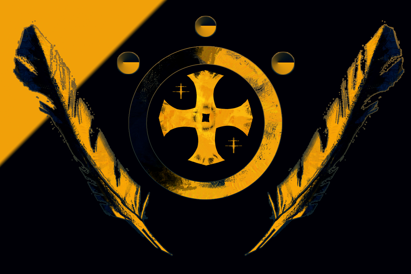 Флаг триумвирата - золотой круг Обитаемых осколков, трое оболов символизирующие города-Осколки триумвирата, перья просвещенной знати и золотой крест пакта с крысанами.