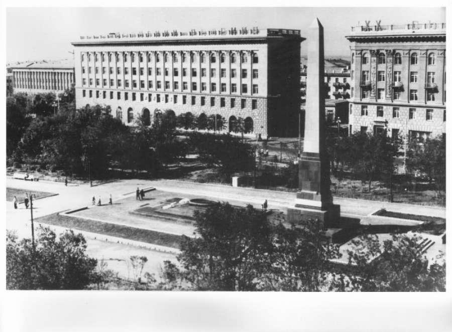Для того, чтобы понять, почему рядом с ним в пятидесятых годах появились именно эти два здания, надо вернуться к истории со вторым проектом послевоенного Дома Советов - https://author.today/post/122013 , который должен был быть построен в дальней от Волги части Площади Павших Борцов, а она (площадь) и Аллея Героев вели бы к нему от самой Набережной: