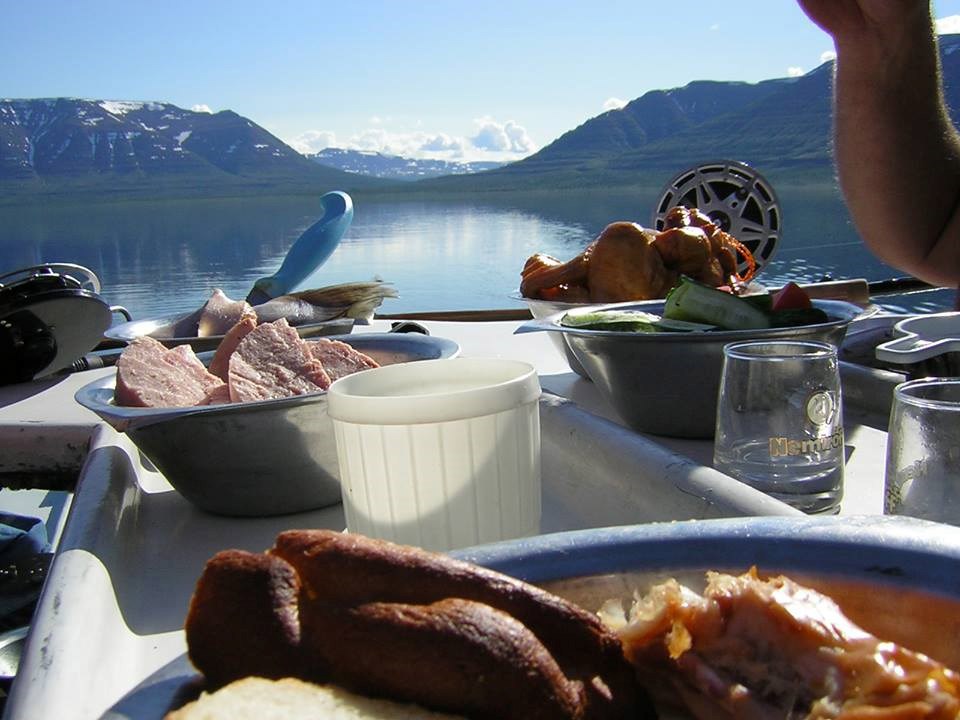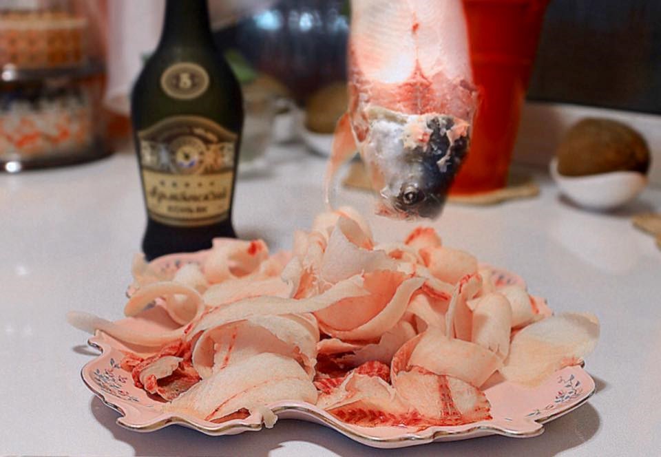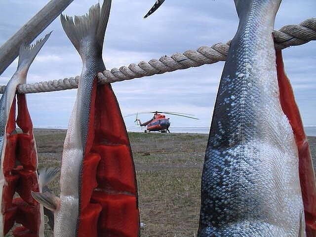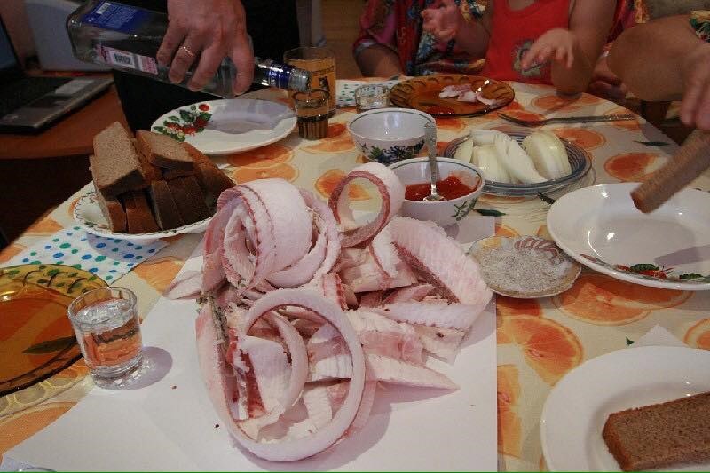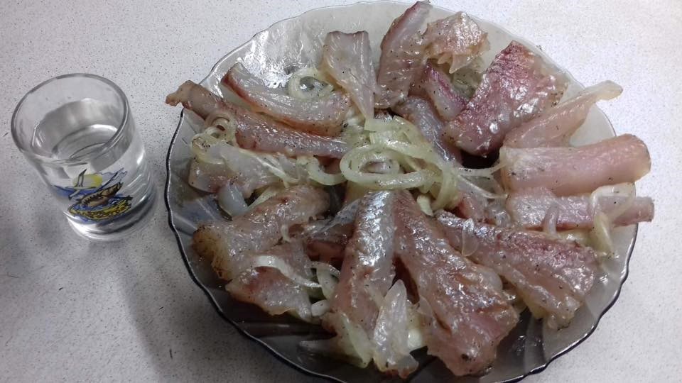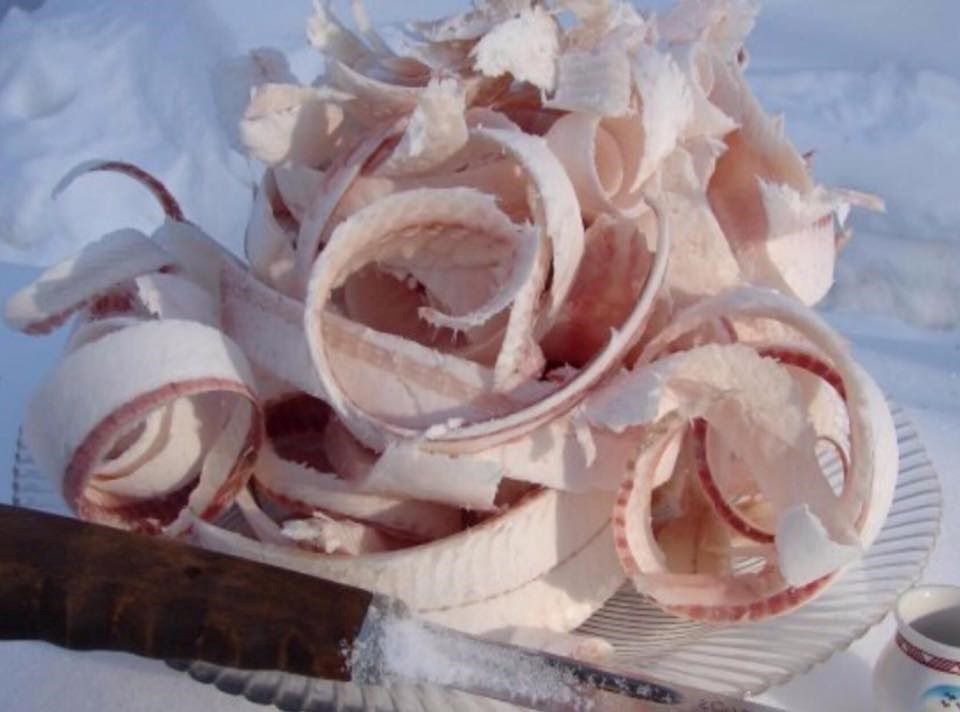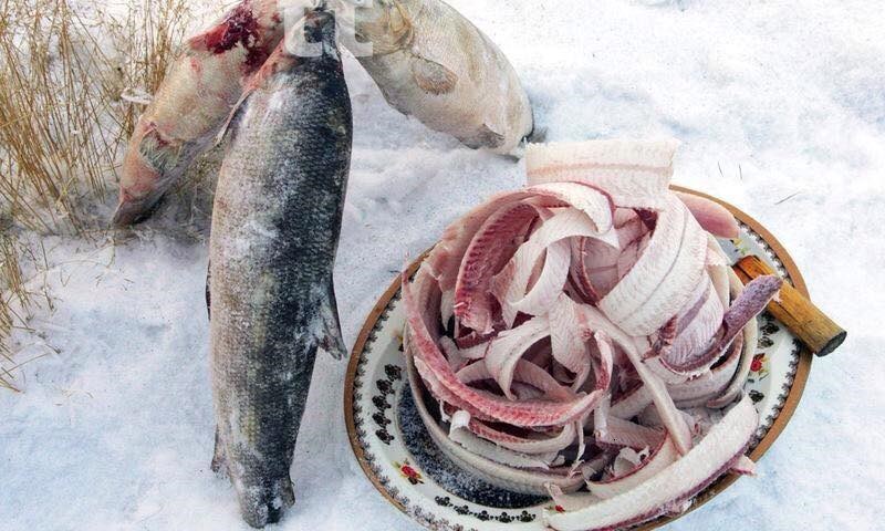 Строганина. К ней полагается ещё и макало то есть соус. У каждого едока своё макало. Я люблю уксус с солью и перцем.
