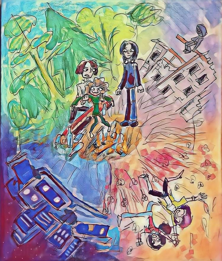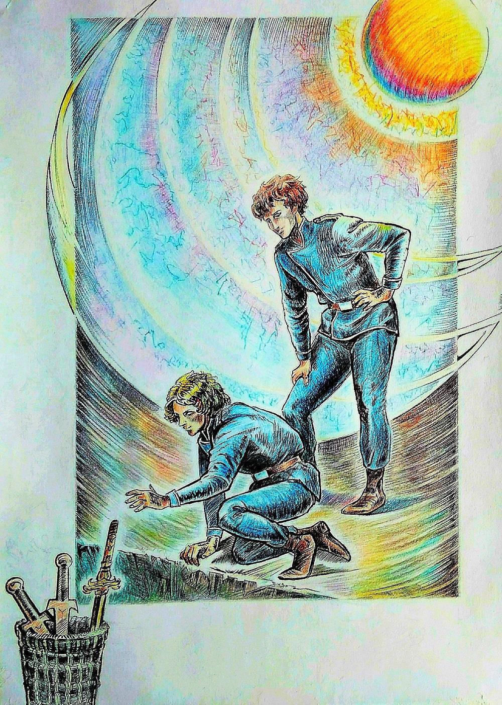 Очень весёленькая работа, я в восторге! Позитивная, яркая. Тут, кстати, тоже присутствует подобная теплохолодность. Типа, два неба -- сливовый вечер и зарево заката. Ещё одно совпадение... Я ж могу взять это на вооружение! Автор арта добровольно дочитал до этого момента, и, похоже, поставил лайк. Просто предположение. Хотя я была рада любым артам, но Настя проиллюстрировала главу, к которой ещё нет картинки в книге.