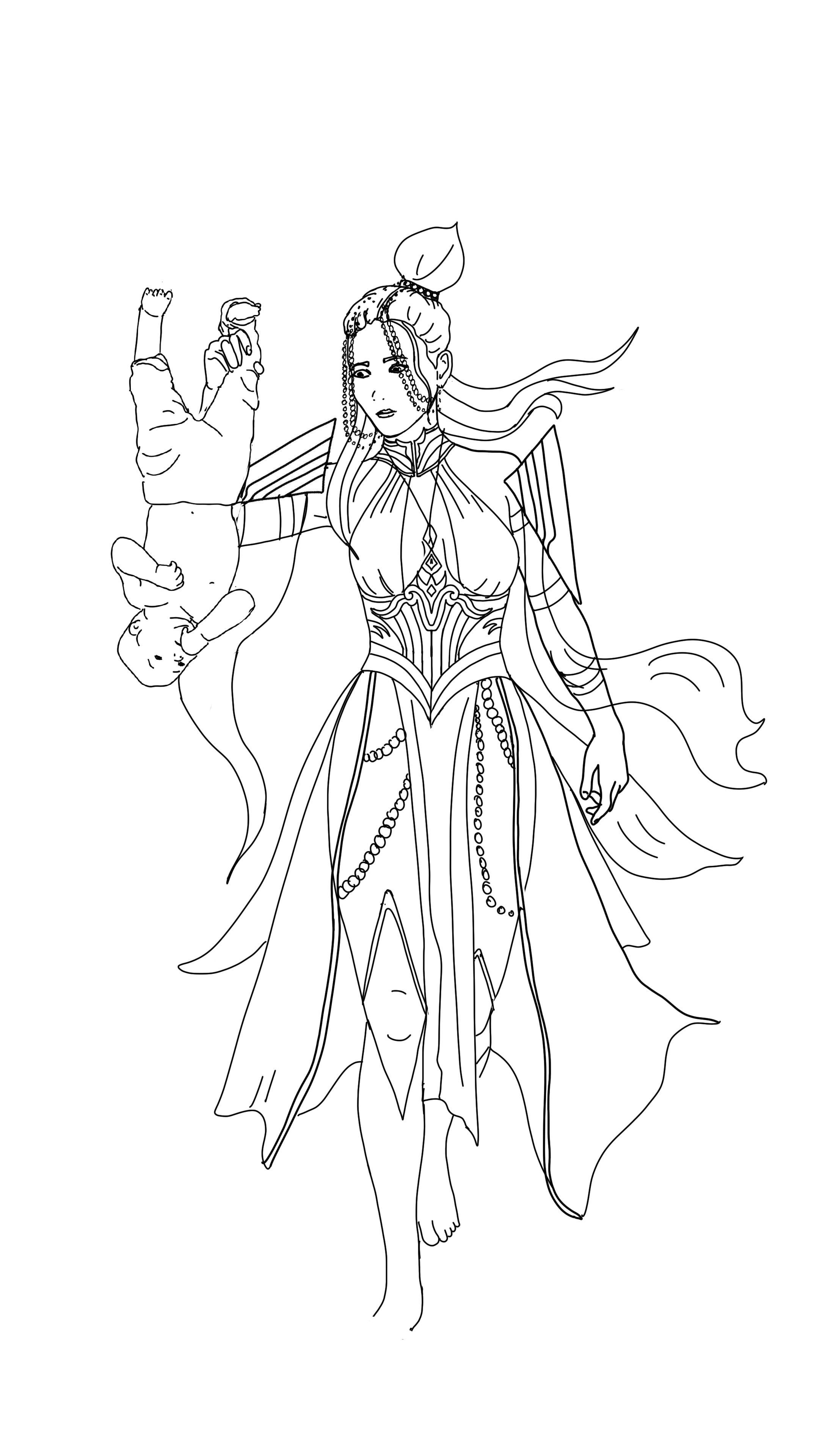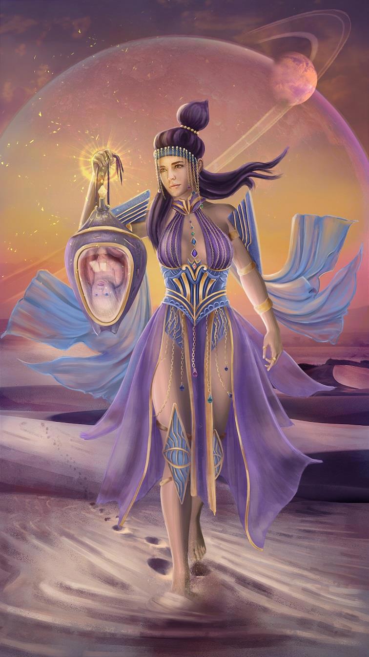 По задумке Дочь Глубин несла героя за ноги. На первоначальном наброске я нарисовала эту сцену именно так. Однако в ходе работы с цветом и добавлением космической бутафории на окружение идея такой носки показалась мне слишком уж простой. Кроме того, по моим догадкам, описывая сцену рождения мастера Розы, автор говорил о его пробуждении иносказательно (если уж мои догадки верны), а значит трактовать текст буквально не следует. Что ж, это развязало мне руки. Для малыша я добавила переноску. Лайк тем, кто догадался что это куколка бабочки.