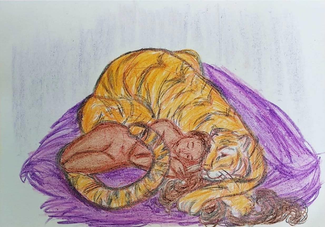 То, что в тексте с тигром она не спит, а только немножко обнимается, тоже побоку — я художник, я так вижу! В общем, рисовать эту парочку было сущим удовольствием! (Особенно позволив себе творить всякий произвол, хе-хе!)