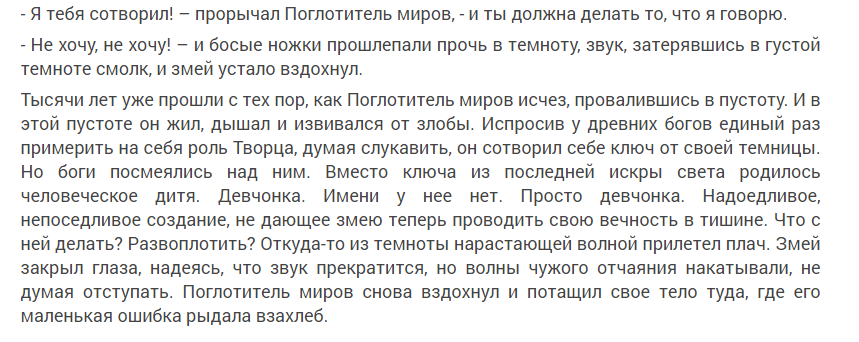 Фрагмент без опознавательных знаков (ну, кроме имени автора), я начинаю пробегать его глазами и — тону! Он меня подхватывает, кружит, искрится, танцует! Трепещут на ветру языки пламени, гудит ритм, и от него уже не сбежать.