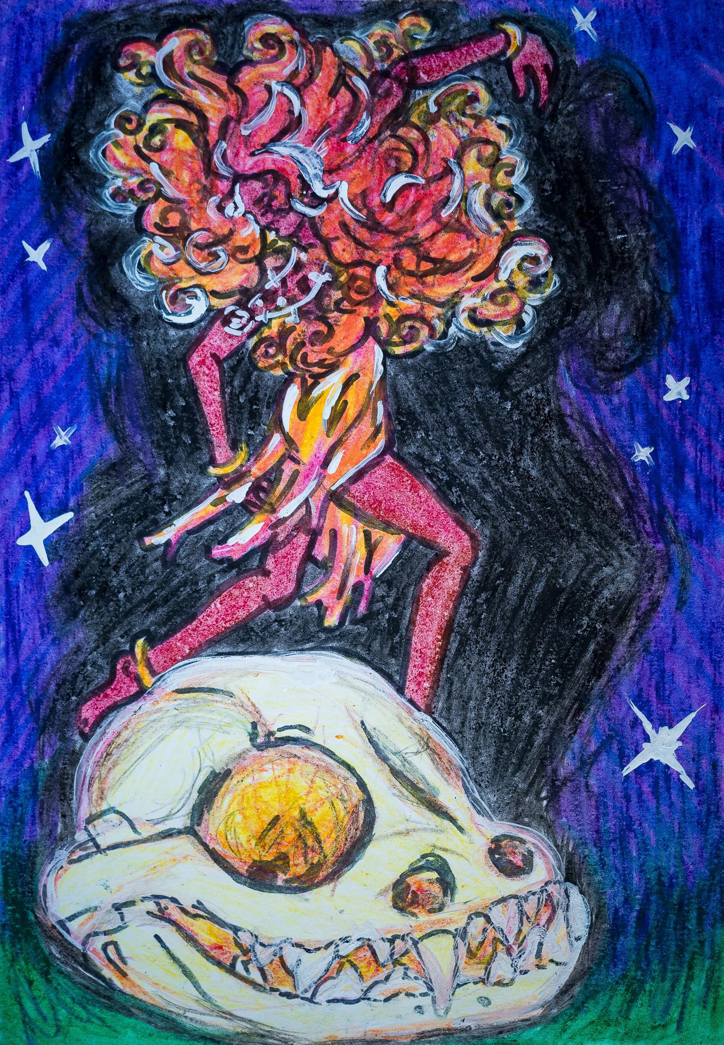 Кстати, Ису я, конечно же, по незыблемой традиции, тоже вначале намеревалась обнажить, но потом то ли не решилась (богиня всё-таки!), то ли припекло выйти за пределы устоявшегося. И маркер для контура возник совершенно спонтанно — никогда так не делала, и безумно боялась испортить! Но череп без контура был вообще невнятен (муж, увидев мельком эскиз, обозвал его яичницей, хнык-хнык), да и богиня сливалась в разноцветное пятно. Пришлось снова рисковать. Ну да, как говорил уж не помню кто, «где нет риска, нет и славы», хе-хе!