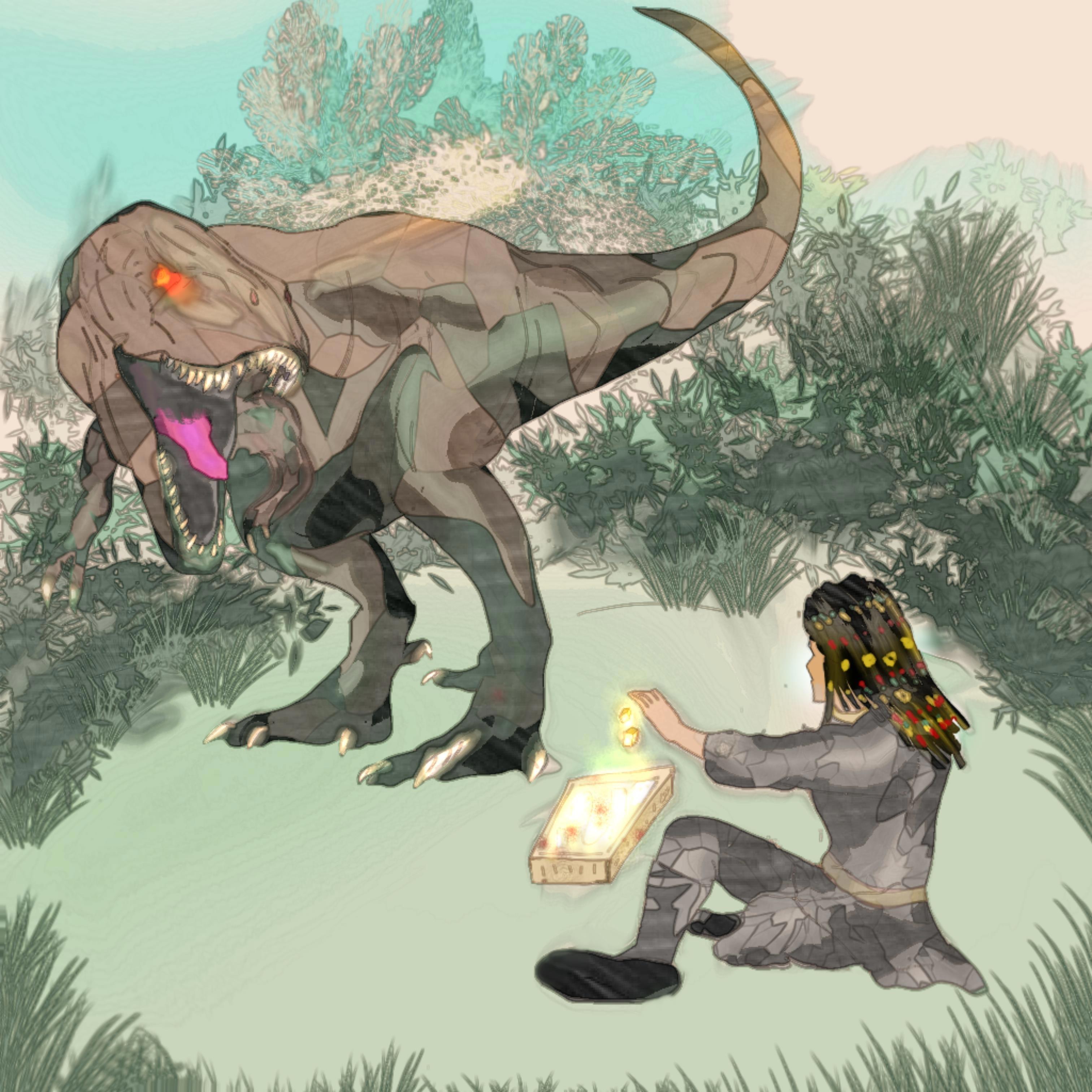 Александр Зарубин нарисовал по "Диким байкам" шикарную внеконкурсную иллюстрацию для момента игры Дарча с Ящером. И да, это не простой тирик, а превращённый космический корабль. Чувак, сидящий напротив - бедолага капитан Дарч, пытающийся вернуть всё по местам)) насколько у него это выйдет можно почитать в повести "Дикие байки из джунглей" - она небольшая.