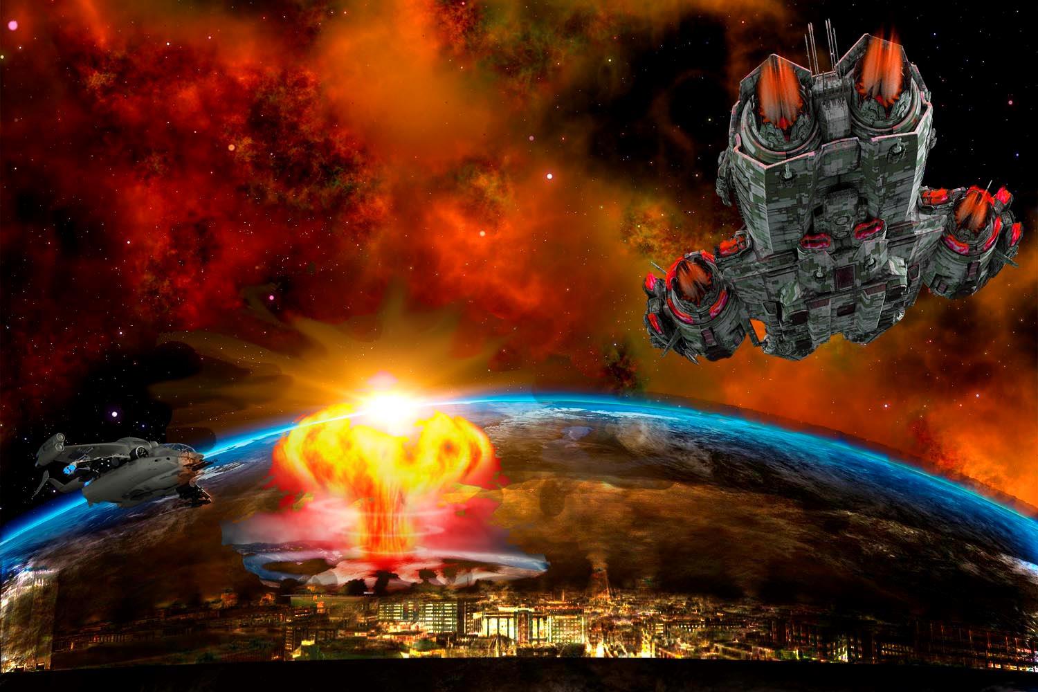 Для иллюстрации я выбрала сцену, когда звездолёт-наблюдатель плывёт над мёртвой планетой и видит, как всё ещё летающий военный корабль продолжает обстреливать давно погибшую планету.