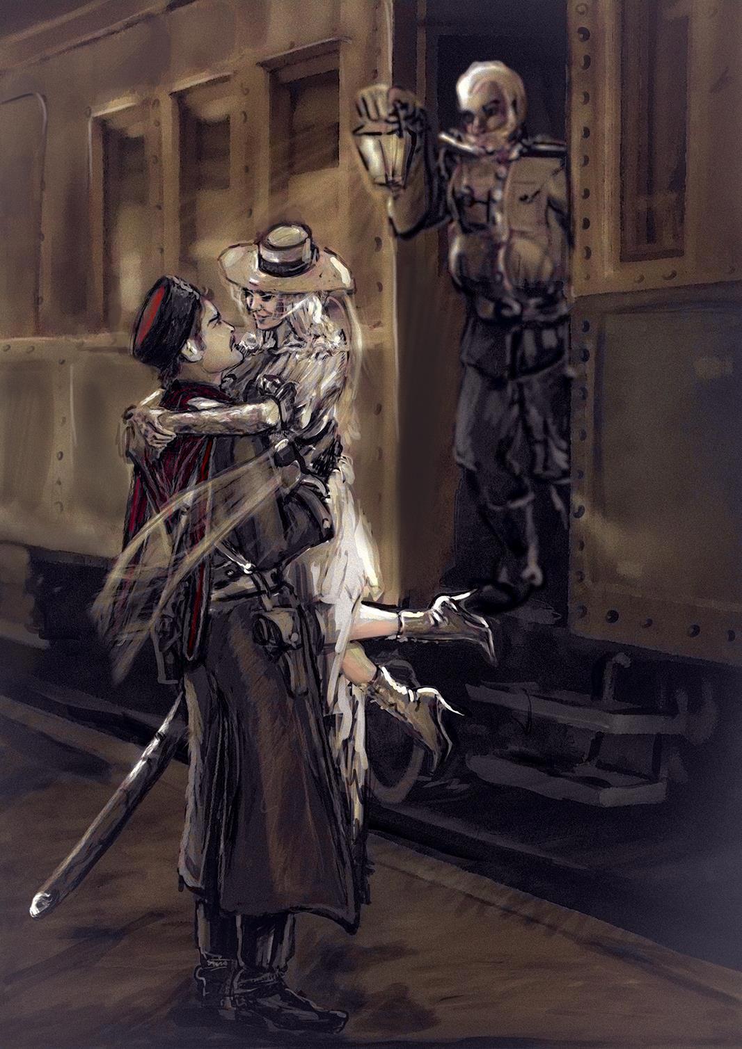 Граф обычно галантный с дамами не выдержал — наглость этой очаровательной бестии переходила все границы. Подполковник сделал шаг к вагону и когда девушка была уже на ступеньке подхватил её лёгким вальсирующим движением, успев изумиться насколько непрошеная гостья легка и изящна. Талию в прямом смысле можно было обхватить пальцами.