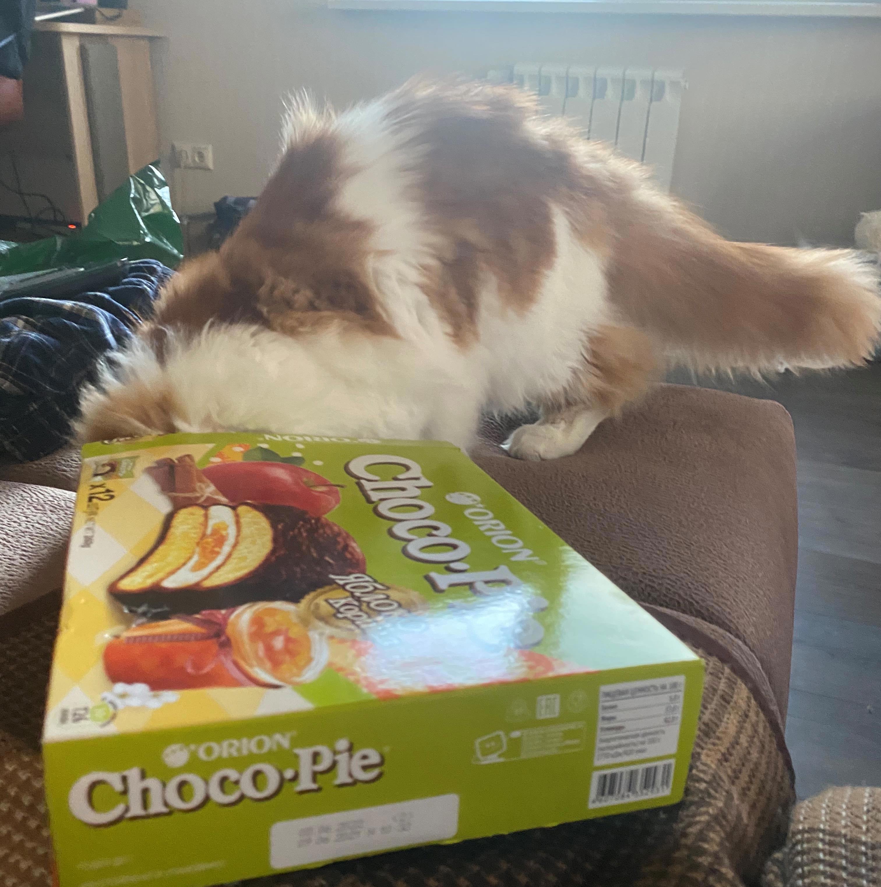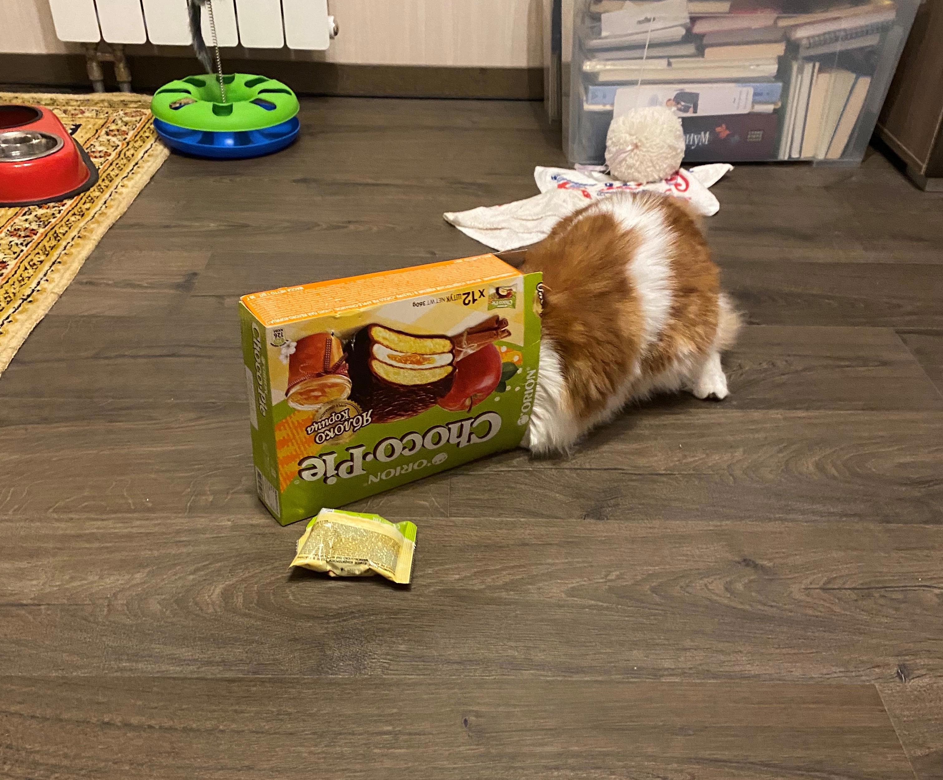 4. Чокопай, коробки от которого Кнопа прогрызает, достаёт пирожные в обёртке и приносит нам (видимо, в надежде, что мы откроем).